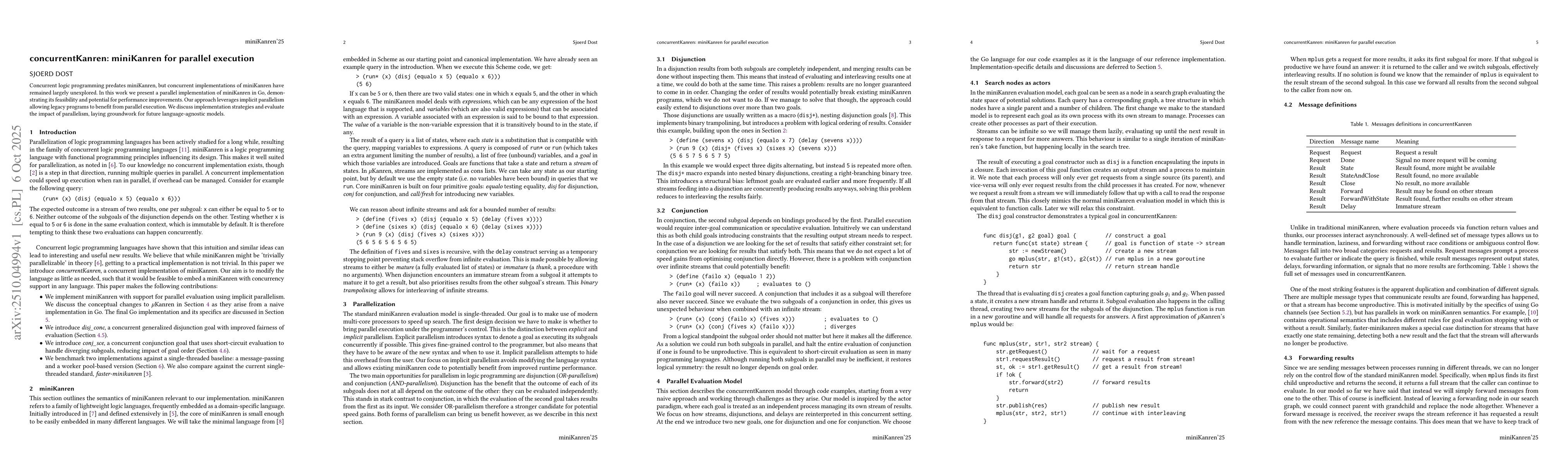 Introduces a message-passing model for miniKanren that supports implicit parallelism, generalized disjunction, and short-circuit evaluation for conjunctions, differing from traditional miniKanren's function-return-based evaluation.
