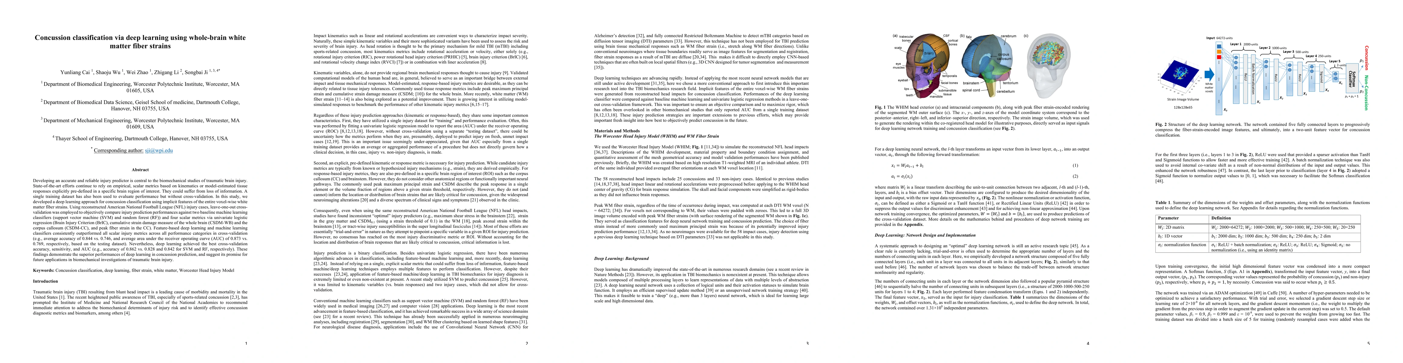 This study developed a deep learning model for concussion classification using whole-brain white matter fiber strains, outperforming traditional scalar metrics and machine learning classifiers in cross-validation, indicating deep learning's potential for improving traumatic brain injury predictions.