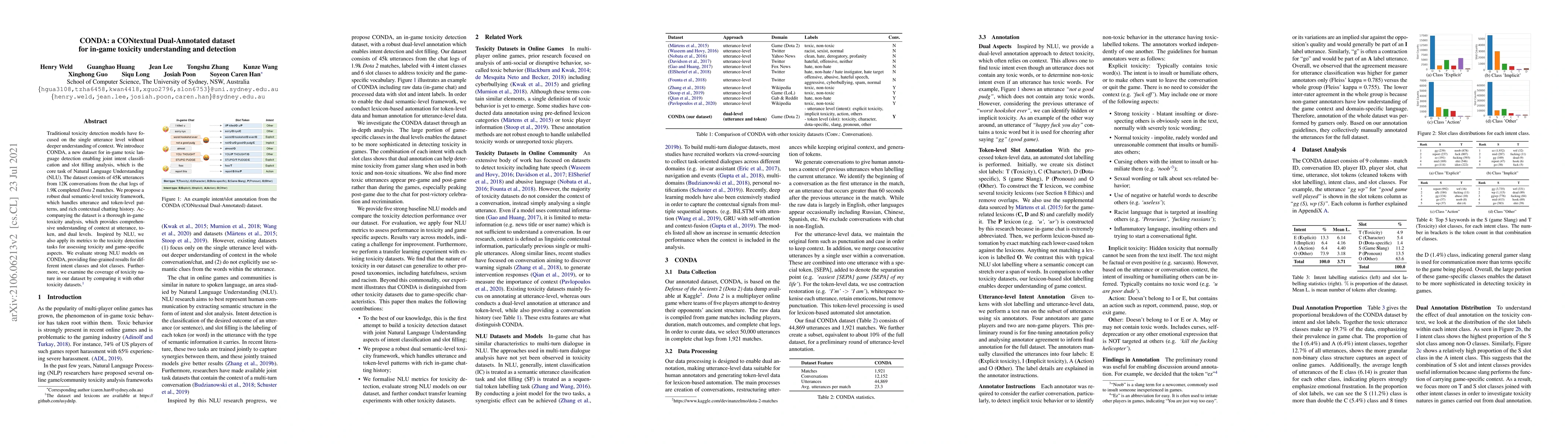 CONDA is a new dataset for detecting in-game toxicity, featuring 45K utterances from 12K conversations in Dota 2 matches, enabling joint intent classification and slot filling. It evaluates NLU models for fine-grained toxicity detection and compares its contextual coverage with other toxicity datasets.
