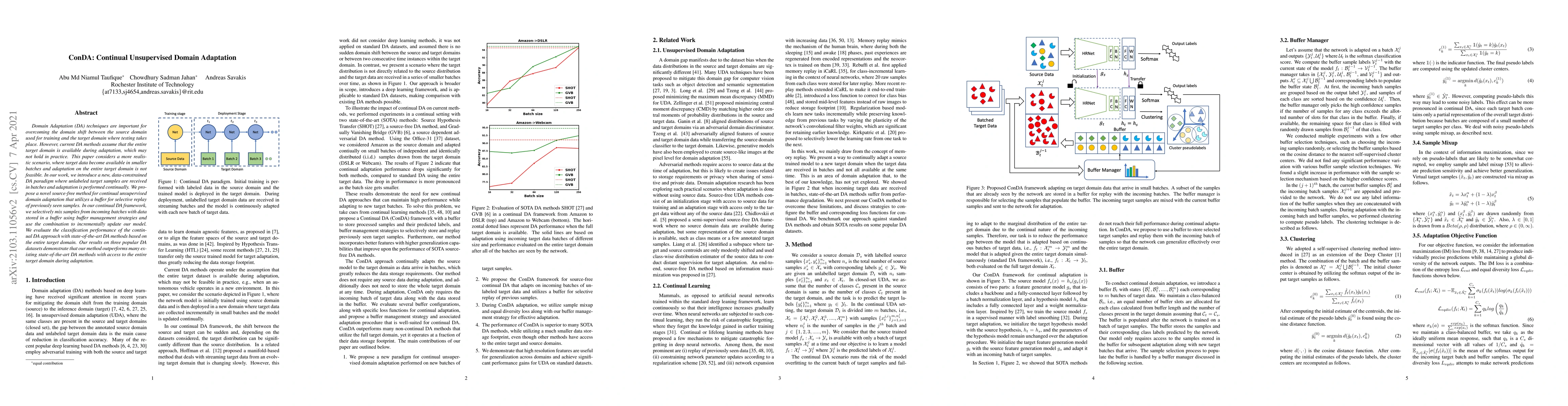 This paper introduces ConDA, a continual unsupervised domain adaptation method that adapts to target domain data arriving in batches, rather than all at once. It employs a buffer for selective replay and incremental model updates, outperforming existing methods that require full target domain access.