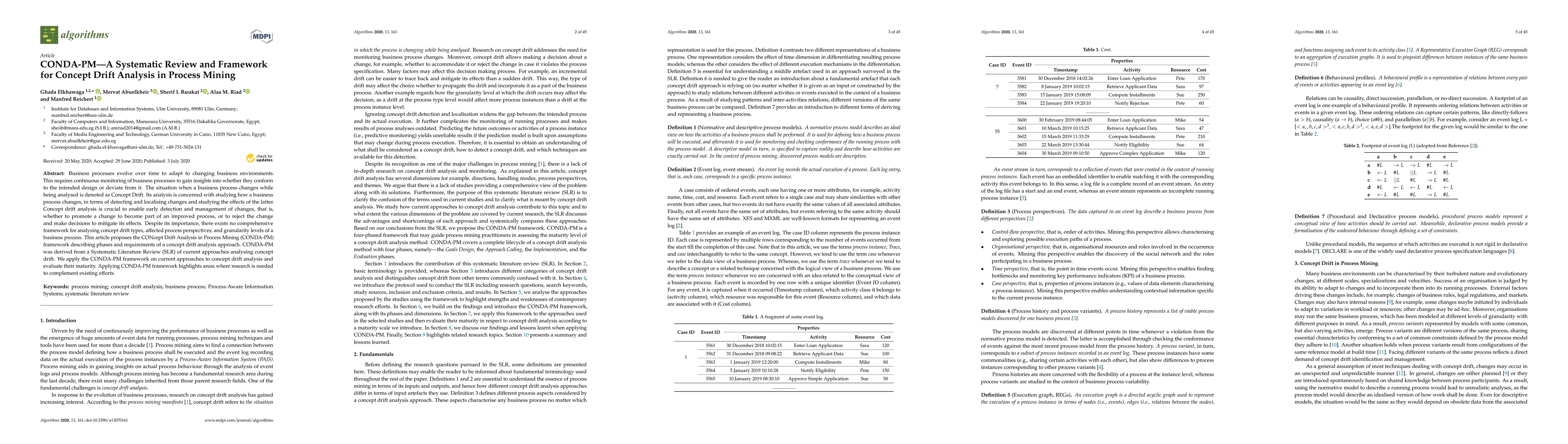 This paper proposes the CONDA-PM framework for analyzing concept drift in business processes, derived from a systematic literature review. It identifies gaps in current approaches and highlights areas requiring further research to improve concept drift analysis.