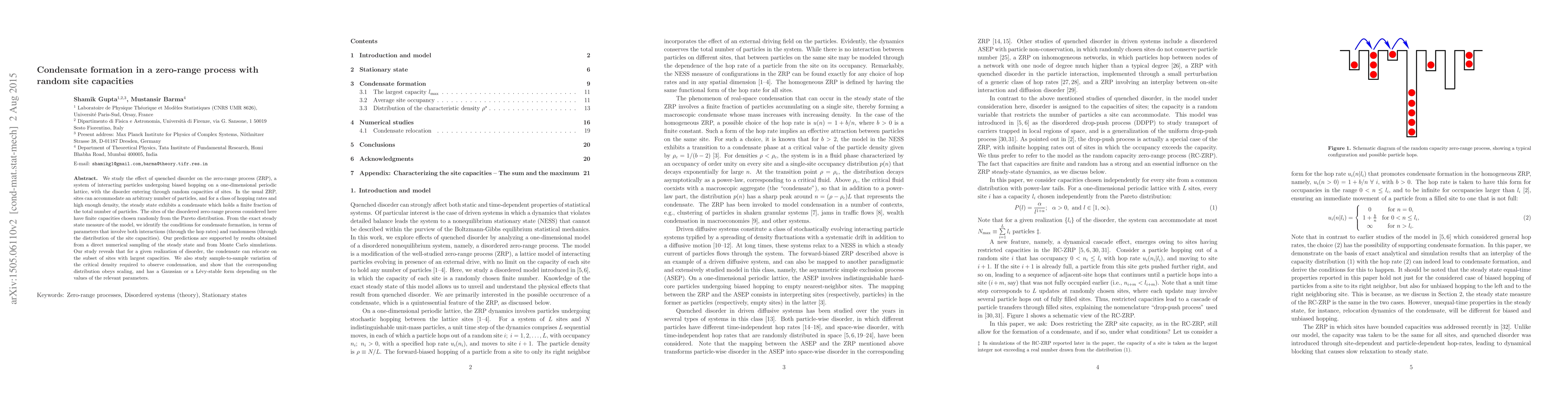 This paper investigates how quenched disorder, introduced through random site capacities, affects condensate formation in the zero-range process on a one-dimensional lattice. It identifies conditions for condensate formation based on hop rates and site capacity distributions, showing that condensates can relocate to sites with the largest capacities and that the critical density for condensation exhibits scaling behavior with Gaussian or Lévy-stable distributions depending on the parameters.