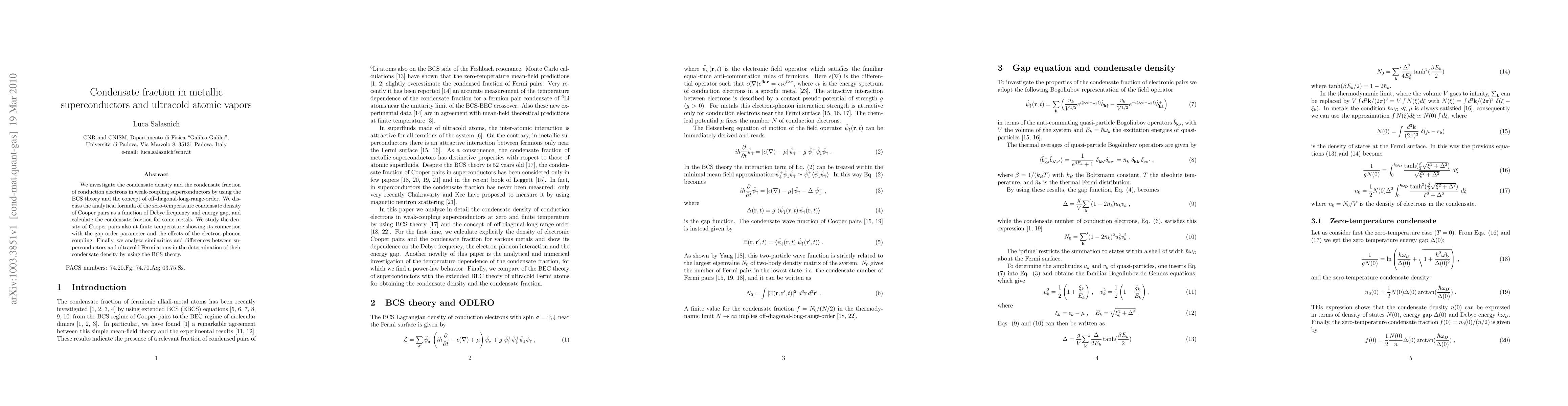 Researchers study condensate density in metallic superconductors and ultracold atomic vapors using BCS theory, finding similarities between superconductors and Fermi atoms in determining their condensate density.
