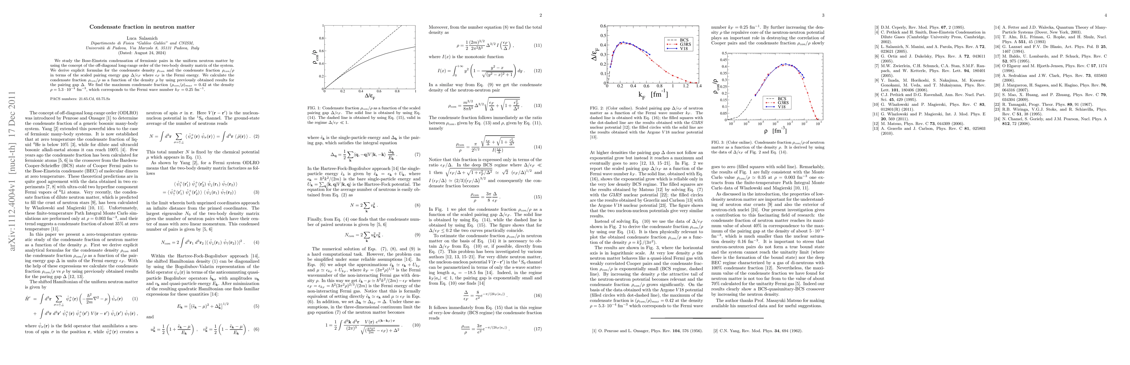 This paper investigates the Bose-Einstein condensation of fermionic pairs in neutron matter, deriving formulas for the condensate density and fraction. It finds that the maximum condensate fraction of 0.42 occurs at a density of $5.3\cdot 10^{-4}$ fm$^{-3}$.
