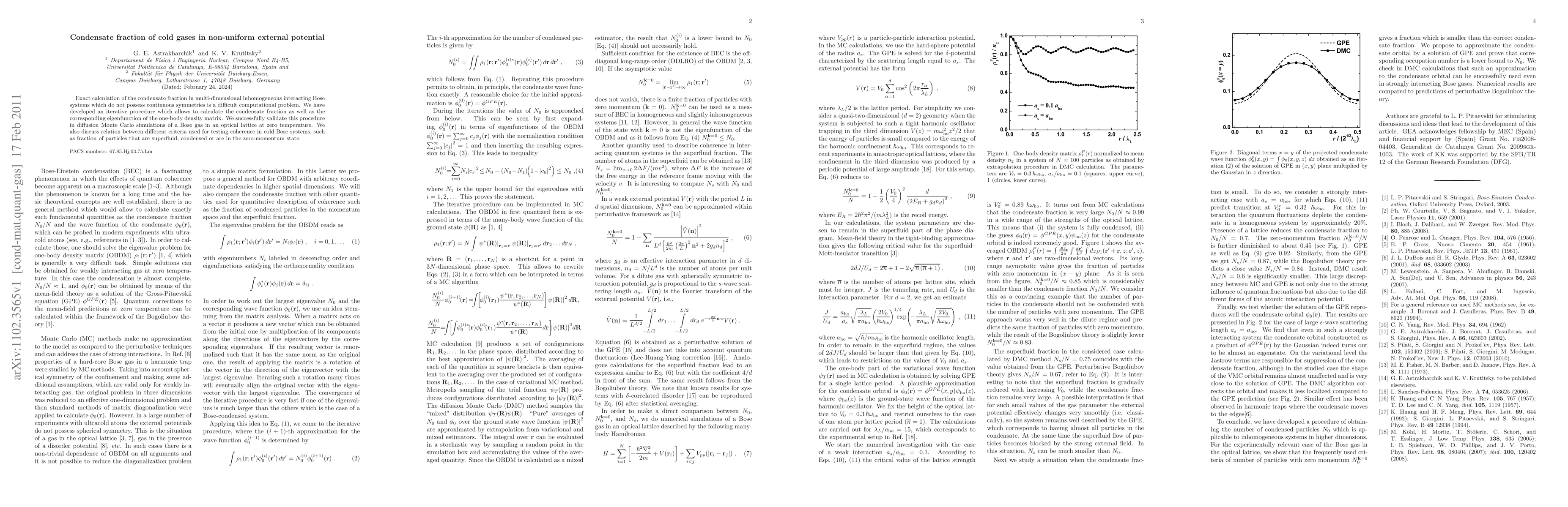 Exact calculation of the condensate fraction in multi-dimensional inhomogeneous interacting Bose systems which do not possess continuous symmetries is a difficult computational problem. We have developed an iterative procedure which allows to calculate the condensate fraction as well as the corresponding eigenfunction of the one-body density matrix. We successfully validate this procedure in diffusion Monte Carlo simulations of a Bose gas in an optical lattice at zero temperature. We also discuss relation between different criteria used for testing coherence in cold Bose systems, such as fraction of particles that are superfluid, condensed or are in the zero-momentum state.