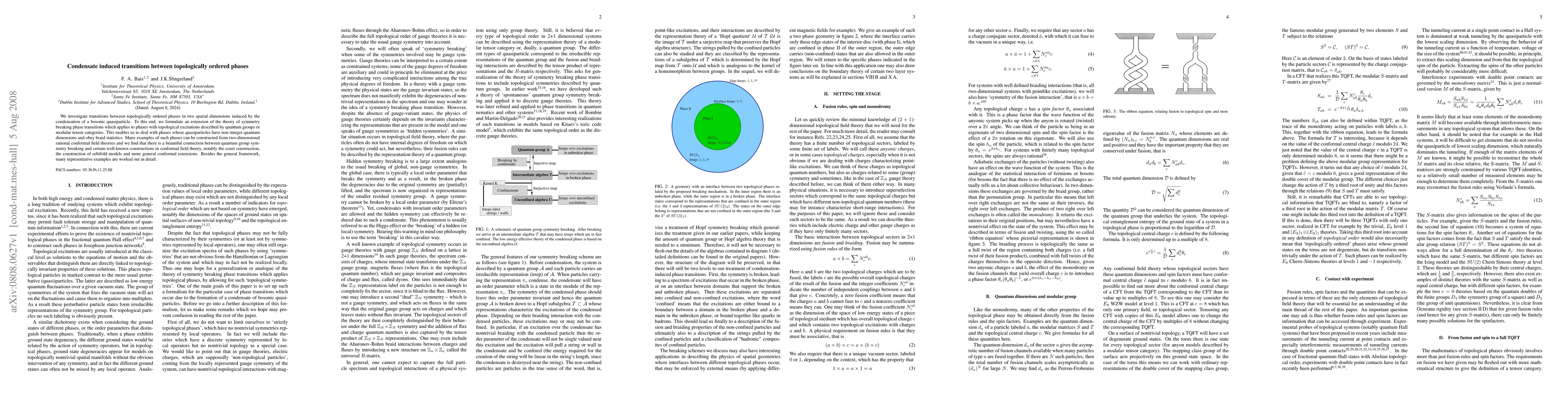 This research develops a theory for transitions between topologically ordered phases in two dimensions driven by the condensation of bosonic quasiparticles, focusing on systems described by quantum groups and modular tensor categories. It reveals deep connections between symmetry breaking in these phases and conformal field theory constructions like coset and orbifold models.