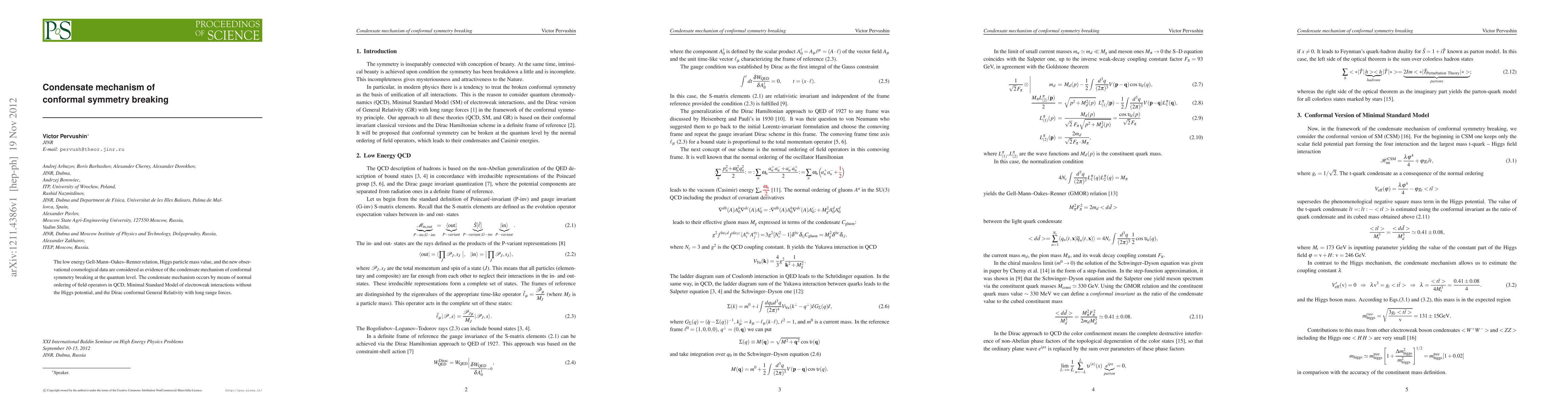 The research demonstrates the condensate mechanism for conformal symmetry breaking at the quantum level, using the Gell-Mann-Oakes-Renner relation, Higgs mass, and cosmological data, and applies it in QCD, the Minimal Standard Model, and Dirac conformal General Relativity.