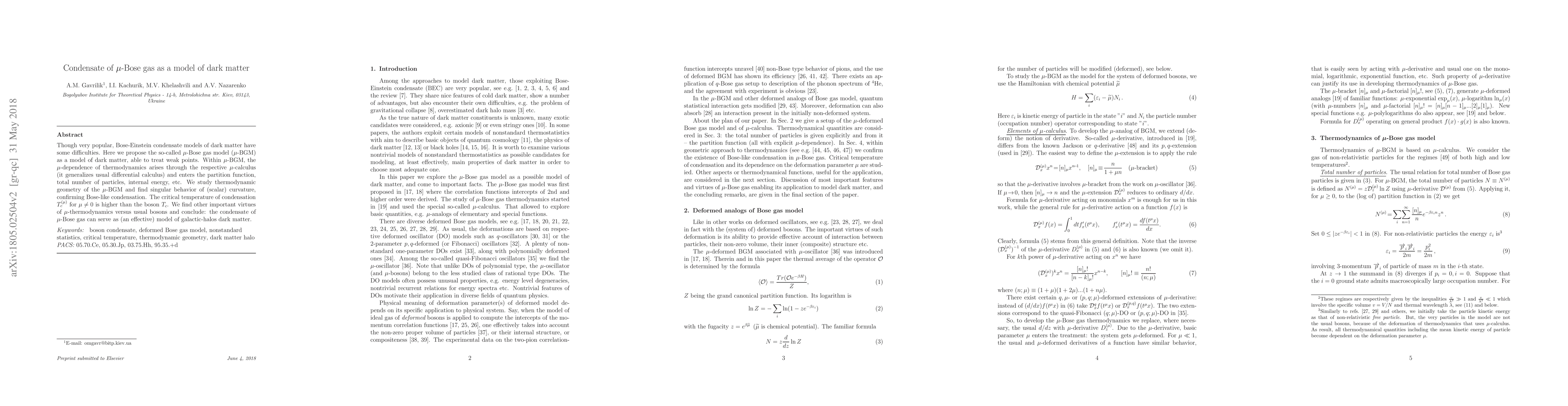 Though very popular, Bose-Einstein condensate models of dark matter have some difficulties. Here we propose the so-called $\mu$-Bose gas model ($\mu$-BGM) as a model of dark matter, able to treat weak points. Within $\mu$-BGM, the $\mu$-dependence of thermodynamics arises through the respective $\mu$-calculus (it generalizes usual differential calculus) and enters the partition function, total number of particles, internal energy, etc. We study thermodynamic geometry of the $\mu$-BGM and find singular behavior of (scalar) curvature, confirming Bose-like condensation. The critical temperature of condensation $T^{(\mu)}_c$ for $\mu\neq 0$ is higher than the boson $T_c$. We find other important virtues of $\mu$-thermodynamics versus usual bosons and conclude: the condensate of $\mu$-Bose gas can serve as (an effective) model of galactic-halos dark matter.