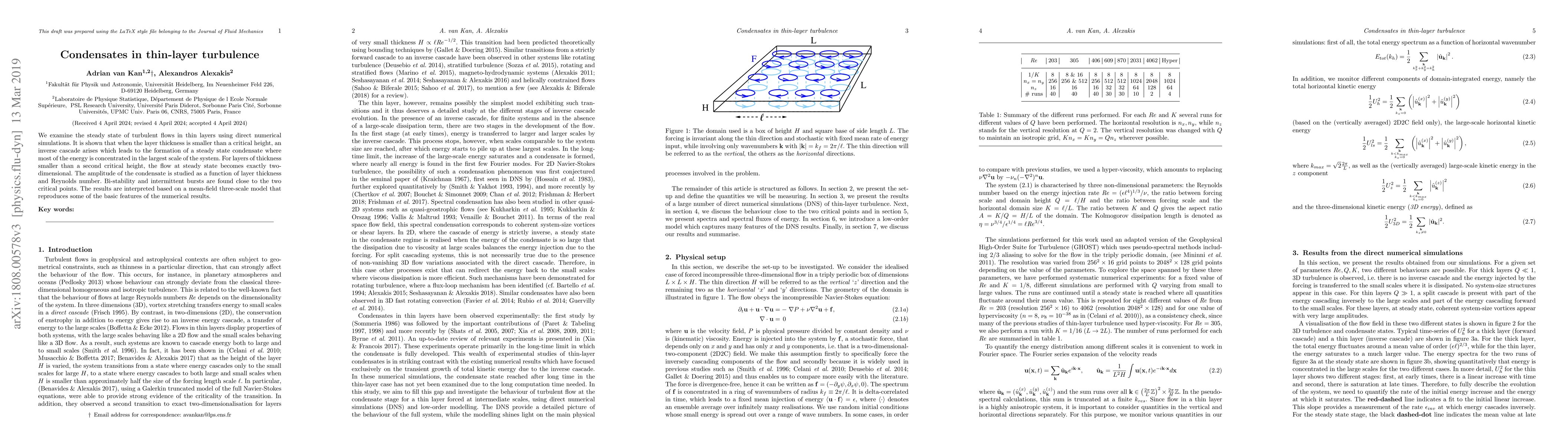 This paper explores turbulent flows in thin layers, revealing an inverse cascade leading to a steady state condensate where energy concentrates at the largest scale. The study identifies critical layer thicknesses for transitioning to two-dimensional flow and examines bi-stability and intermittent bursts near these thresholds, supported by a mean field three-scale model.