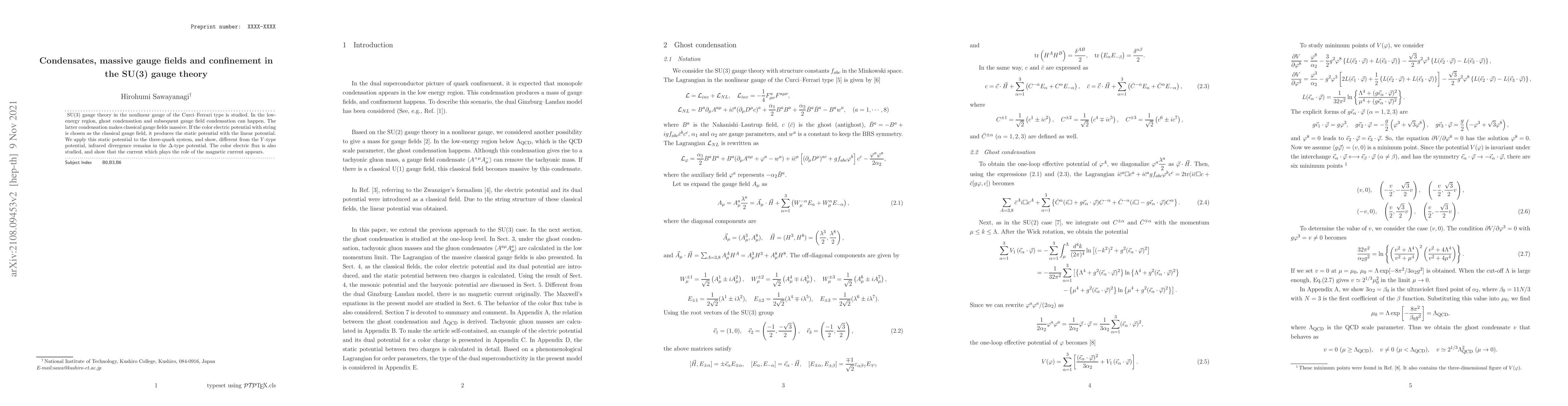 SU(3) gauge theory in the nonlinear gauge of the Curci--Ferrari type is studied. In the low-energy region, ghost condensation and subsequent gauge field condensation can happen. The latter condensation makes classical gauge fields massive. If the color electric potential with string is chosen as the classical gauge field, it produces the static potential with the linear potential. We apply this static potential to the three-quark system, and show, different from the $Y$-type potential, infrared divergence remains in the $\Delta$-type potential. The color electric flux is also studied, and show that the current which plays the role of the magnetic current appears.