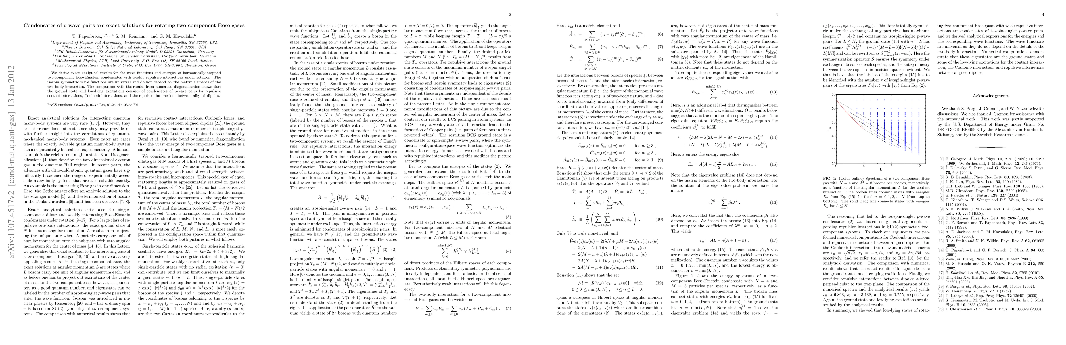 We derive exact analytical results for the wave functions and energies of harmonically trapped two-component Bose-Einstein condensates with weakly repulsive interactions under rotation. The isospin symmetric wave functions are universal and do not depend on the matrix elements of the two-body interaction. The comparison with the results from numerical diagonalization shows that the ground state and low-lying excitations consists of condensates of p-wave pairs for repulsive contact interactions, Coulomb interactions, and the repulsive interactions between aligned dipoles.
