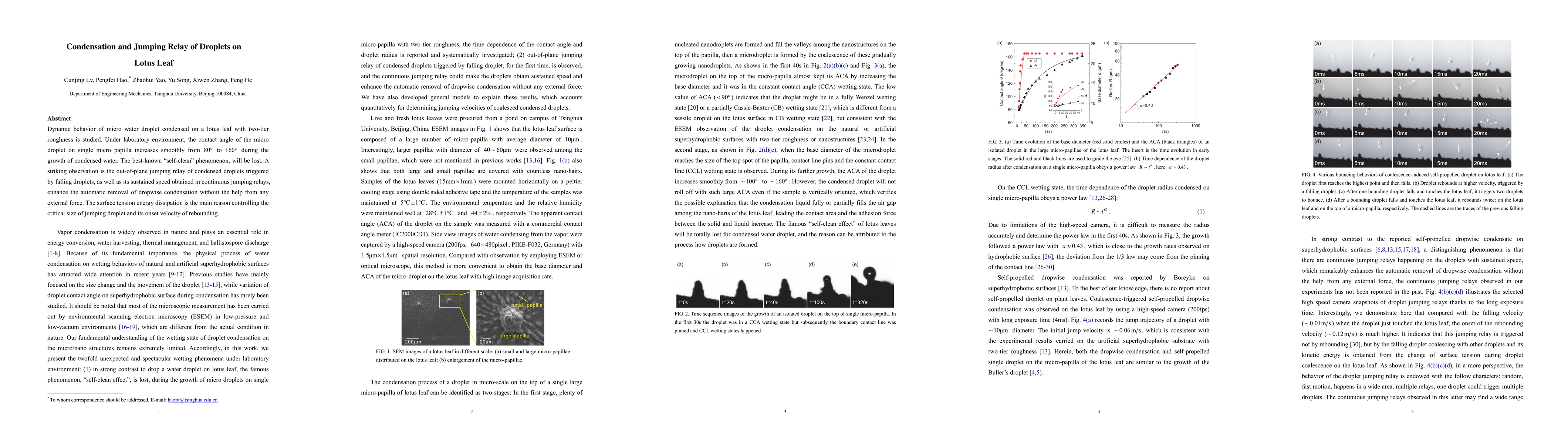 This study investigates the dynamic behavior of condensed micro water droplets on lotus leaves with a two-tier roughness structure, revealing an out-of-plane jumping relay mechanism that facilitates automatic droplet removal without external forces. The surface tension energy dissipation governs the critical size and rebounding velocity of the jumping droplets.