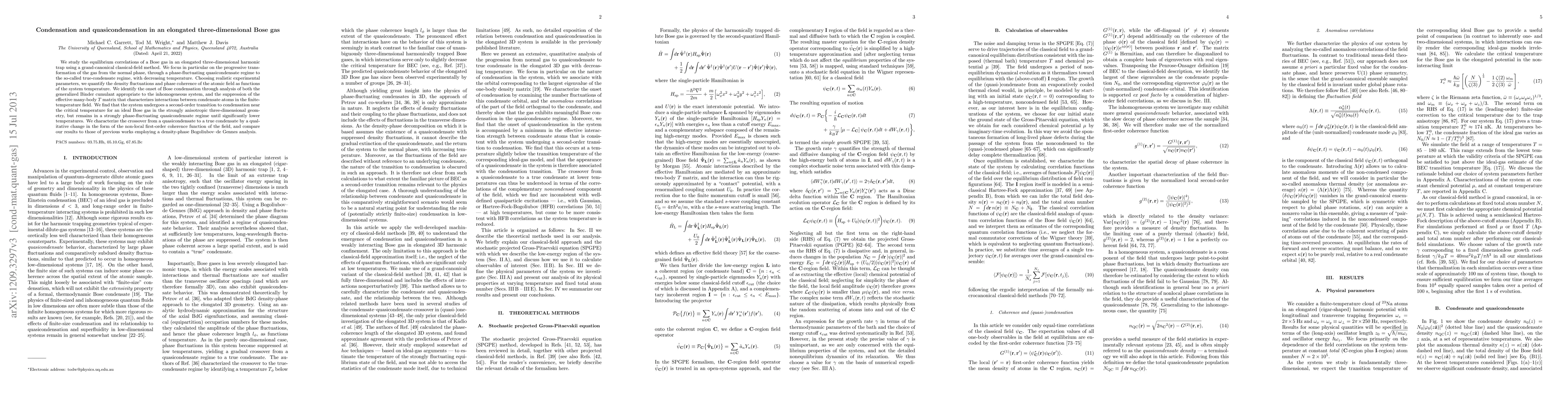 This research investigates the transition of a Bose gas in an elongated three-dimensional trap from a normal phase to a quasicondensate and eventually a true condensate as temperature decreases. It uses a grand-canonical classical-field method to quantify density fluctuations and phase coherence, identifying a second-order transition to condensation near the critical temperature, while the system remains in a quasicondensate regime at lower temperatures.