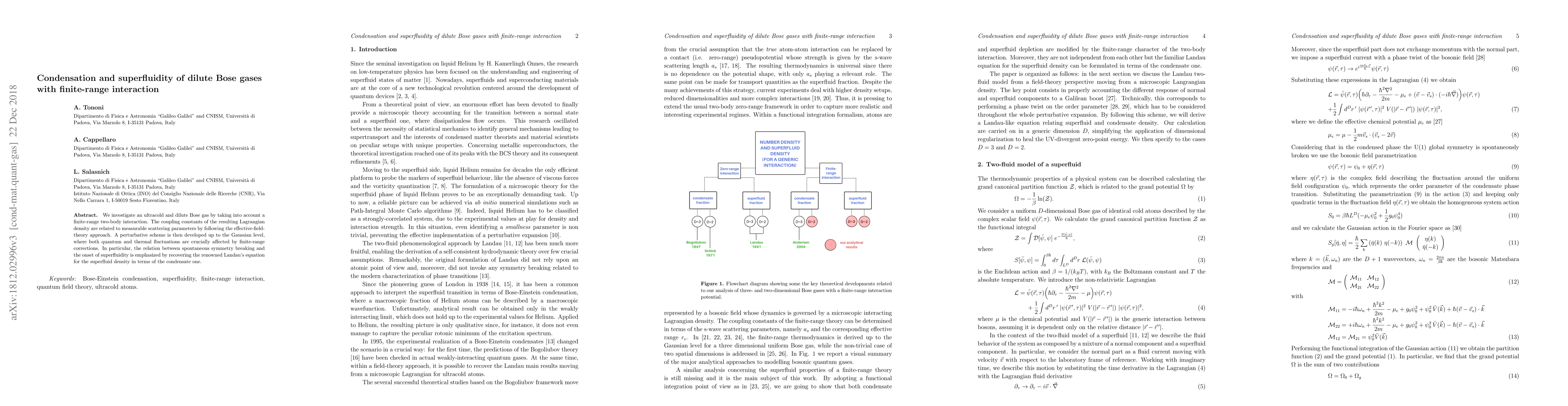This paper explores the condensation and superfluidity in ultracold, dilute Bose gases with finite-range interactions, using an effective-field-theory approach. It develops a perturbative scheme to the Gaussian level, revealing how finite-range corrections influence quantum and thermal fluctuations, and establishes the connection between spontaneous symmetry breaking and superfluidity.