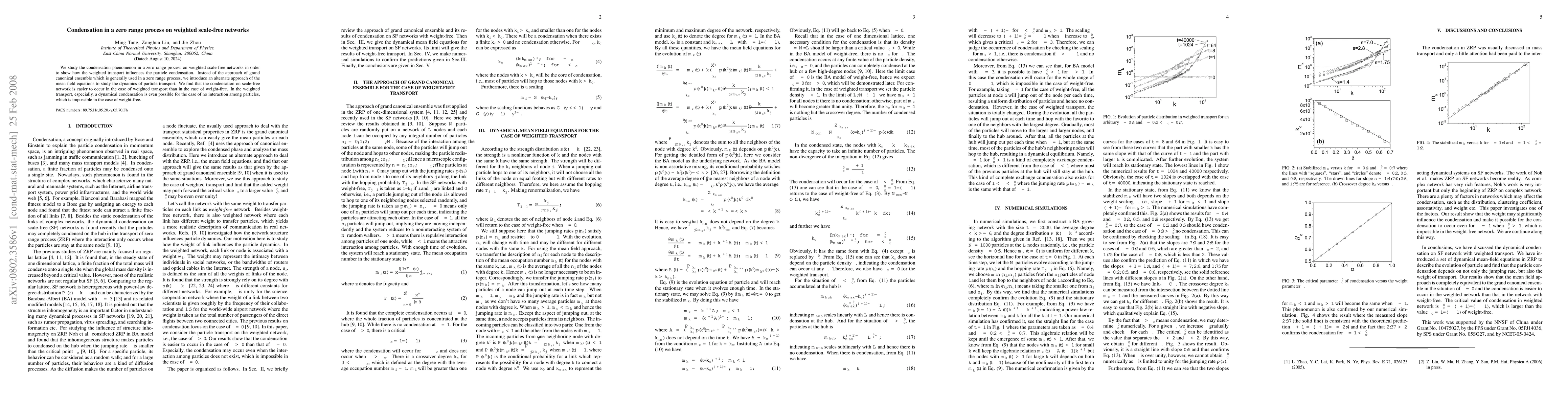 This paper investigates particle condensation in a zero range process on weighted scale-free networks, demonstrating that weighted transport facilitates condensation more than weight-free transport. The study uses mean field equations instead of the grand canonical ensemble, revealing that dynamic condensation can occur without particle interactions in weighted transport.