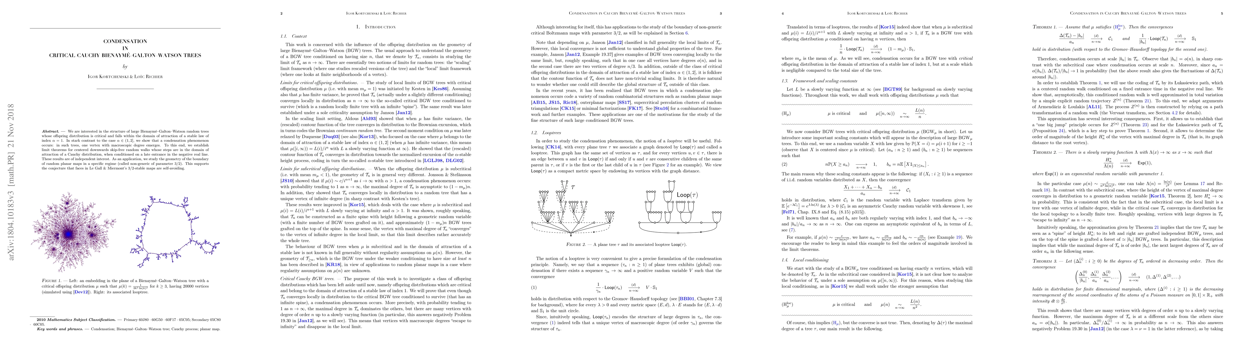 This paper investigates the structure of large critical Bienaymé-Galton-Watson trees with offspring distribution in the domain of attraction of a Cauchy law, revealing a condensation phenomenon where a single vertex attains a macroscopic degree. It also establishes limit theorems for centered downwards skip-free random walks and applies these findings to the geometry of the boundary of random planar maps in a non-generic regime.