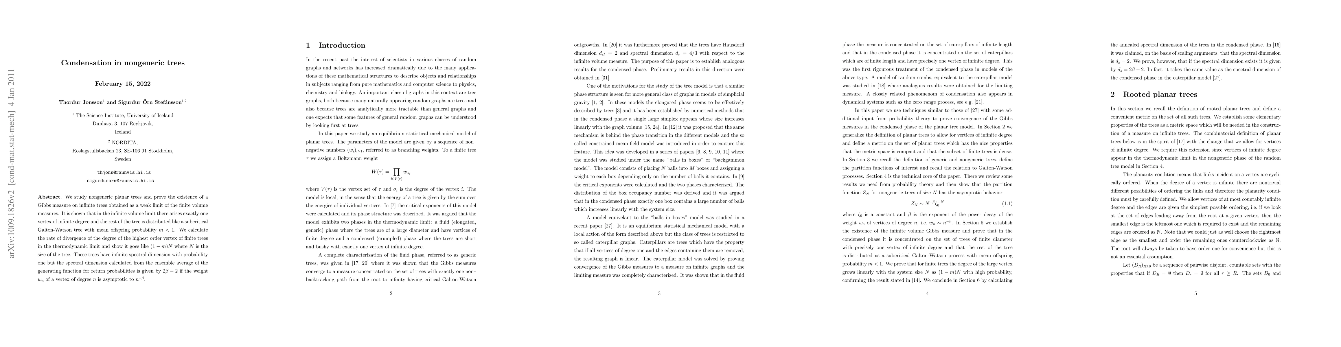 We study nongeneric planar trees and prove the existence of a Gibbs measure on infinite trees obtained as a weak limit of the finite volume measures. It is shown that in the infinite volume limit there arises exactly one vertex of infinite degree and the rest of the tree is distributed like a subcritical Galton-Watson tree with mean offspring probability $m<1$. We calculate the rate of divergence of the degree of the highest order vertex of finite trees in the thermodynamic limit and show it goes like $(1-m)N$ where $N$ is the size of the tree. These trees have infinite spectral dimension with probability one but the spectral dimension calculated from the ensemble average of the generating function for return probabilities is given by $2\beta -2$ if the weight $w_n$ of a vertex of degree $n$ is asymptotic to $n^{-\beta}$.