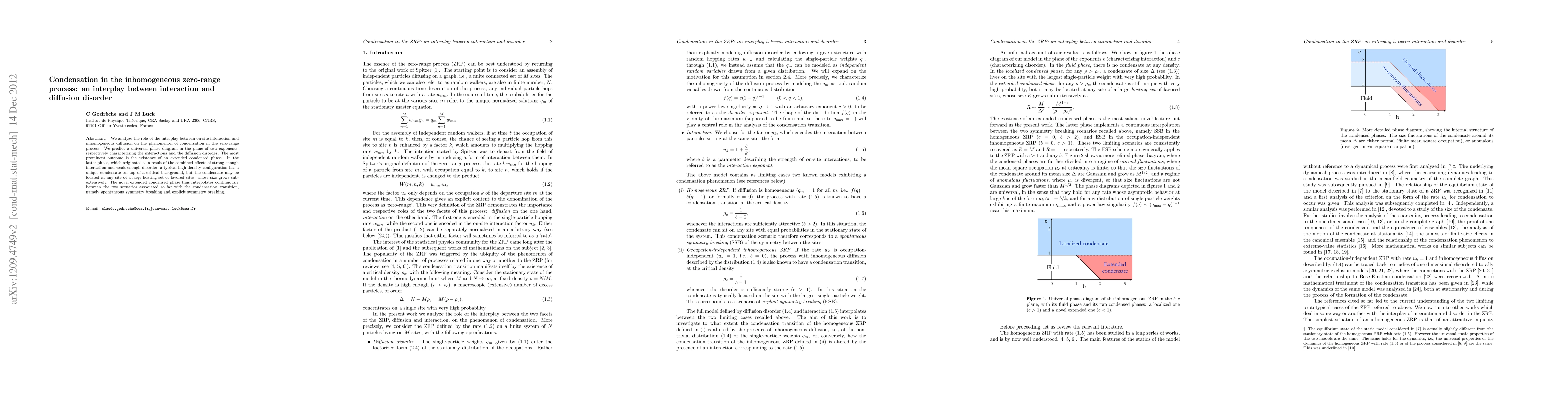 This paper investigates how on-site interactions and inhomogeneous diffusion disorder interact to influence condensation in the zero-range process, predicting a universal phase diagram. It reveals an extended condensed phase where a unique condensate forms on a critical background, located at any of a sub-extensively growing set of favored sites, interpolating between spontaneous and explicit symmetry breaking.