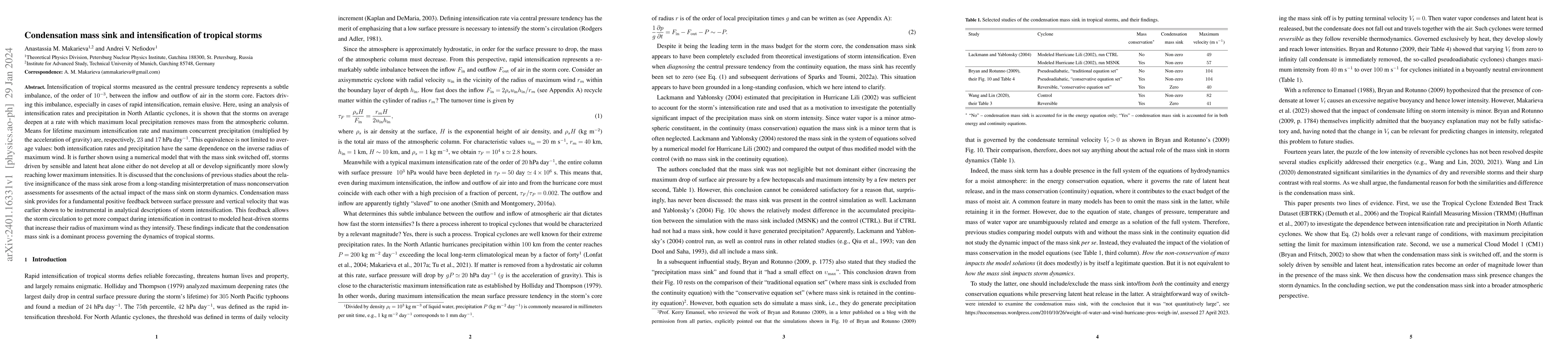 This paper demonstrates that the intensification of tropical storms is fundamentally driven by the condensation mass sink, where precipitation removes mass from the atmospheric column, leading to a positive feedback that enhances storm dynamics. The study shows that the rate of storm intensification correlates with precipitation rates, indicating the crucial role of the mass sink in storm development and intensification.