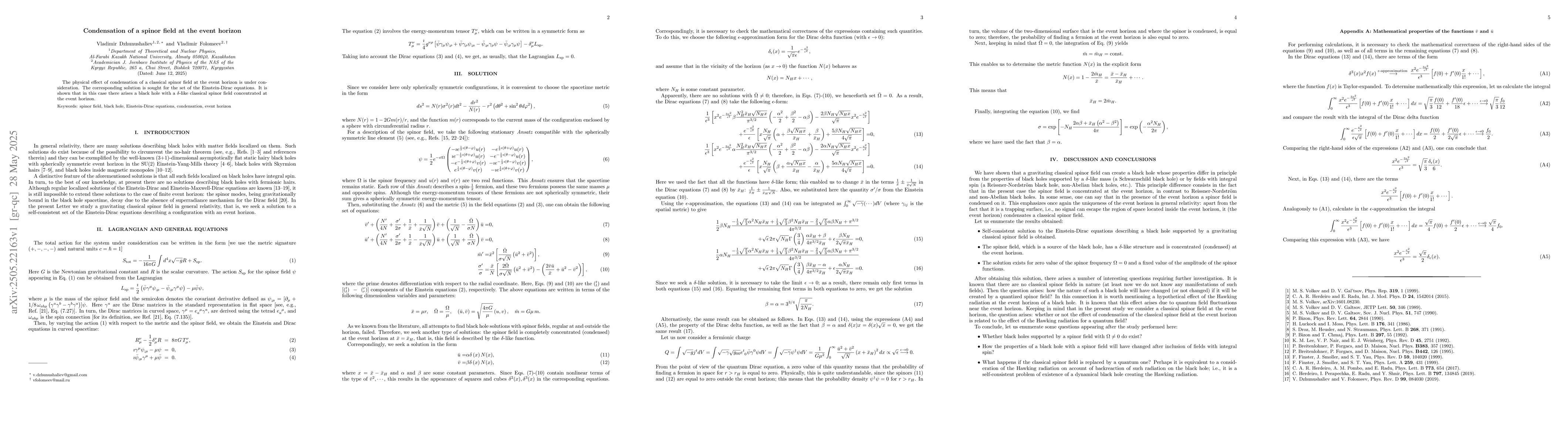 The paper presents a novel solution to the Einstein-Dirac equations describing a black hole with a $\delta$-function spinor field at the horizon.