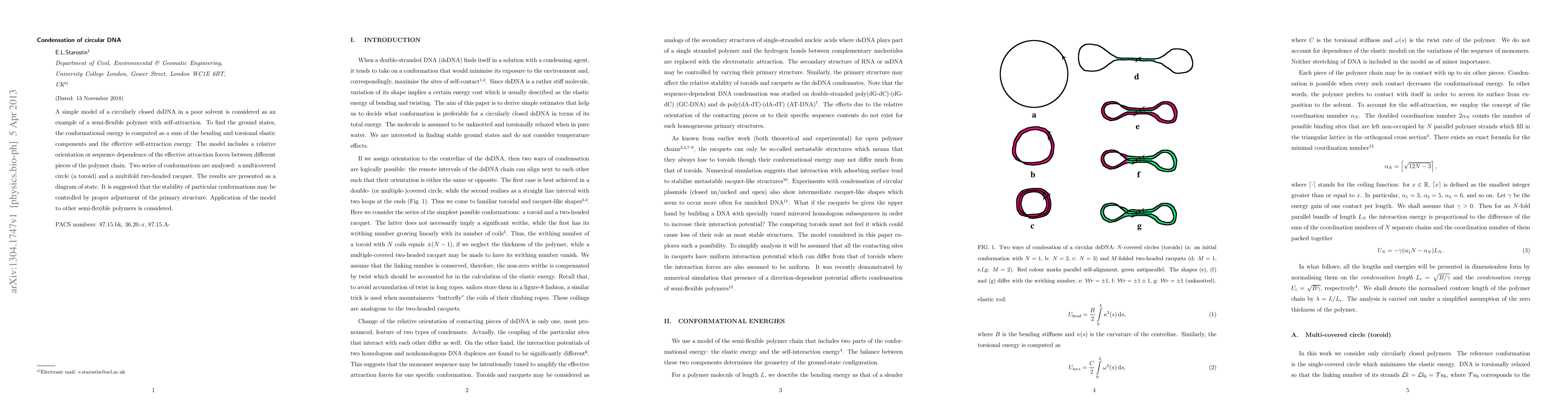 A simple model of a circularly closed dsDNA in a poor solvent is considered as an example of a semi-flexible polymer with self-attraction. To find the ground states, the conformational energy is computed as a sum of the bending and torsional elastic components and the effective self-attraction energy. The model includes a relative orientation or sequence dependence of the effective attraction forces between different pieces of the polymer chain. Two series of conformations are analysed: a multicovered circle (a toroid) and a multifold two-headed racquet. The results are presented as a diagram of state. It is suggested that the stability of particular conformations may be controlled by proper adjustment of the primary structure. Application of the model to other semi-flexible polymers is considered.