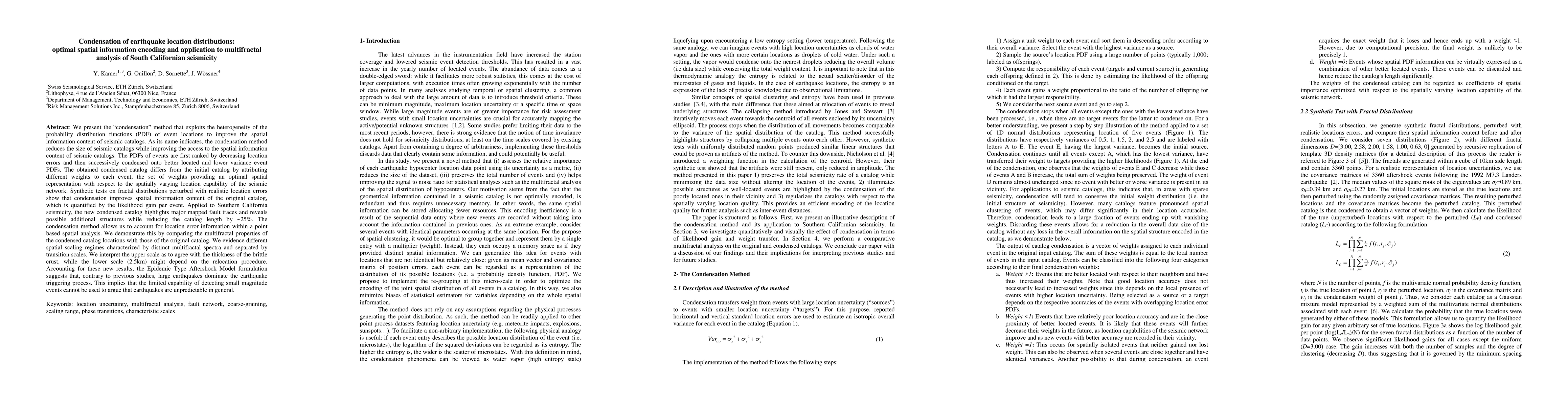 We present the "condensation" method that exploits the heterogeneity of the probability distribution functions (PDF) of event locations to improve the spatial information content of seismic catalogs. The method reduces the size of seismic catalogs while improving the access to the spatial information content of seismic catalogs. The PDFs of events are first ranked by decreasing location errors and then successively condensed onto better located and lower variance event PDFs. The obtained condensed catalog attributes different weights to each event, providing an optimal spatial representation with respect to the spatially varying location capability of the seismic network. Synthetic tests on fractal distributions perturbed with realistic location errors show that condensation improves spatial information content of the original catalog. Applied to Southern California seismicity, the new condensed catalog highlights major mapped fault traces and reveals possible additional structures while reducing the catalog length by ~25%. The condensation method allows us to account for location error information within a point based spatial analysis. We demonstrate this by comparing the multifractal properties of the condensed catalog locations with those of the original catalog. We evidence different spatial scaling regimes characterized by distinct multifractal spectra and separated by transition scales. We interpret the upper scale as to agree with the thickness of the brittle crust, while the lower scale (2.5km) might depend on the relocation procedure. Accounting for these new results, the Epidemic Type Aftershock Model formulation suggests that, contrary to previous studies, large earthquakes dominate the earthquake triggering process. This implies that the limited capability of detecting small magnitude events cannot be used to argue that earthquakes are unpredictable in general.
