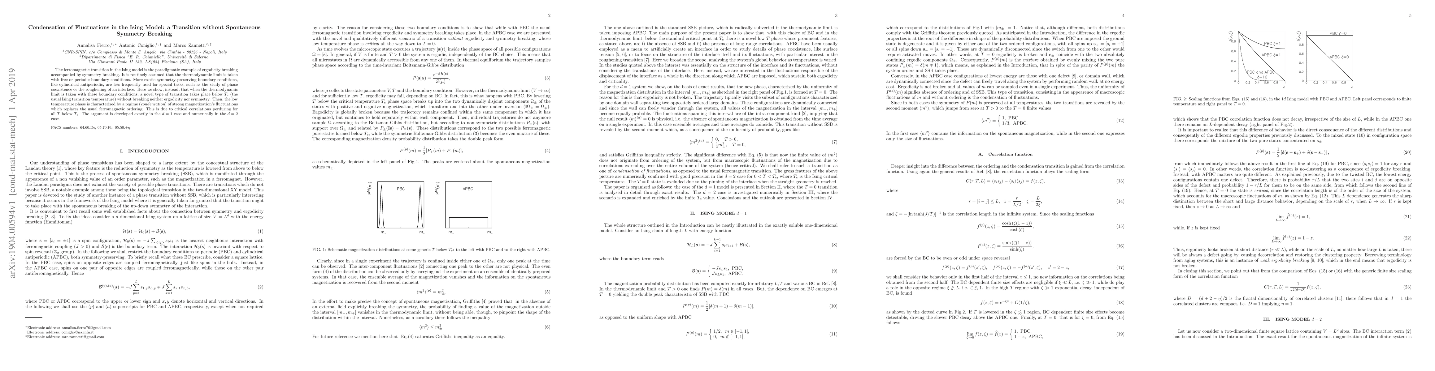 The ferromagnetic transition in the Ising model is the paradigmatic example of ergodicity breaking accompanied by symmetry breaking. It is routinely assumed that the thermodynamic limit is taken with free or periodic boundary conditions. More exotic symmetry-preserving boundary conditions, like cylindrical antiperiodic, are less frequently used for special tasks, such as the study of phase coexistence or the roughening of an interface. Here we show, instead, that when the thermodynamic limit is taken with these boundary conditions, a novel type of transition takes place below $T_c$ (the usual Ising transition temperature) without breaking neither ergodicity nor symmetry. Then, the low temperature phase is characterized by a regime (condensation) of strong magnetization's fluctuations which replaces the usual ferromagnetic ordering. This is due to critical correlations perduring for all T below Tc. The argument is developed exactly in the $d=1$ case and numerically in the d=2 case.