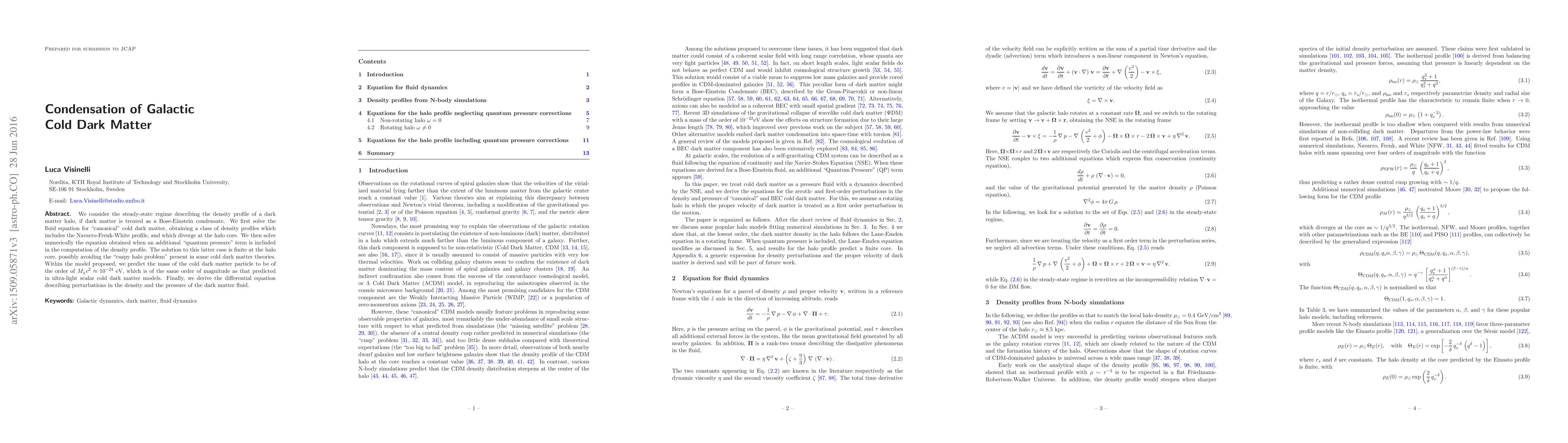 This paper explores the density profile of dark matter halos in the steady-state regime, treating dark matter as a Bose-Einstein condensate. It proposes a model that resolves the "cuspy halo problem" by incorporating a quantum pressure term, predicting a cold dark matter particle mass of around 10^-24 eV.