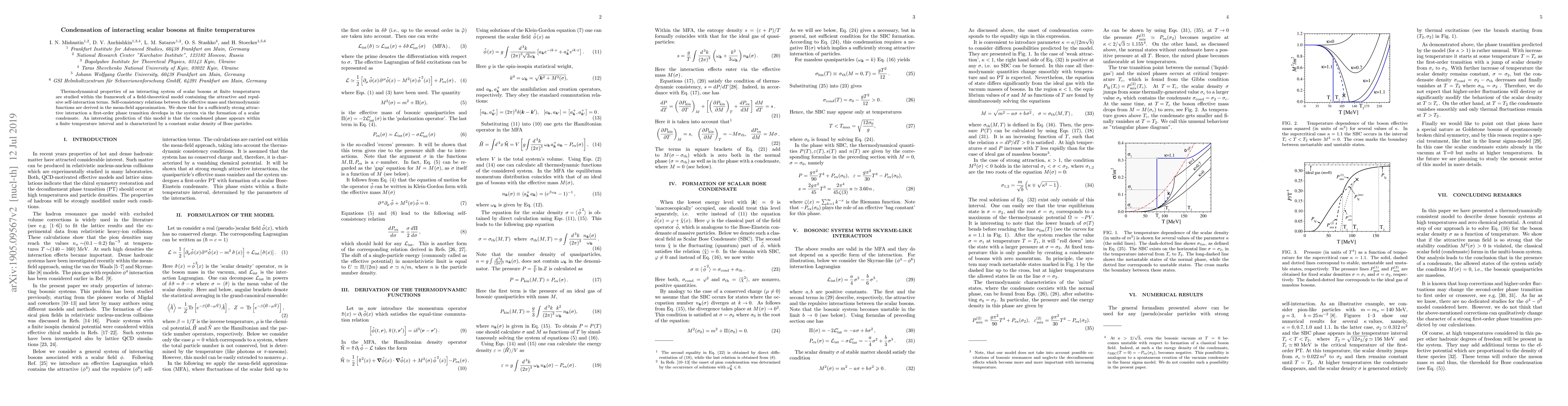 This paper investigates the thermodynamic properties of interacting scalar bosons at finite temperatures, revealing a first-order phase transition leading to a scalar condensate due to strong attractive interactions. The study predicts a finite temperature interval where the condensed phase maintains a constant scalar density.