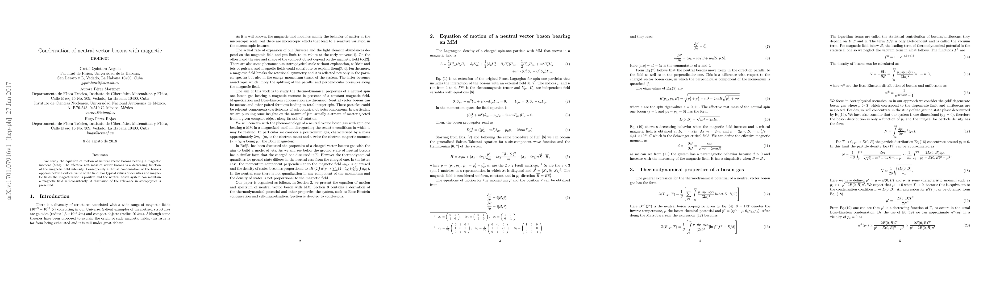 We study the equation of motion of neutral vector bosons bearing a magnetic moment (MM). The effective rest mass of vector bosons is a decreasing function of the magnetic field intensity. Consequently a diffuse condensation of the bosons appears below a critical value of the field. For typical values of densities and magnetic fields the magnetization is positive and the neutral boson system can maintain a magnetic field self-consistently. A discussion of the relevance in astrophysics is presented.