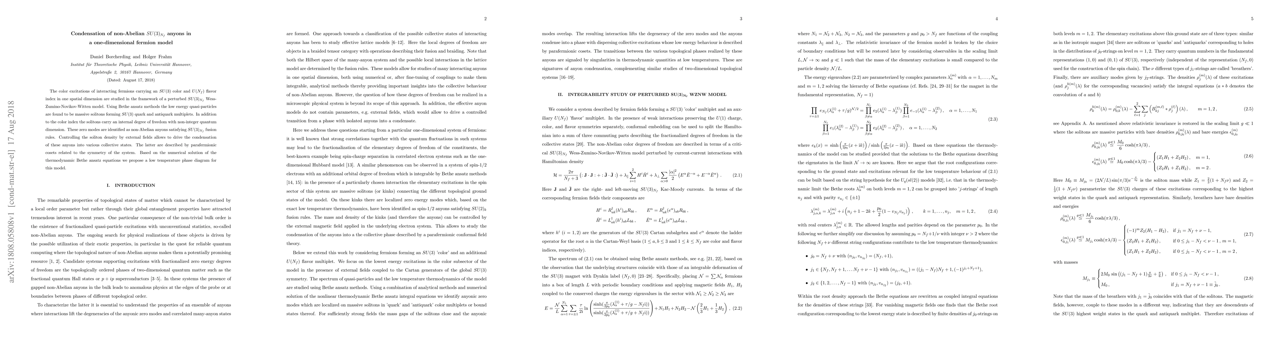 The color excitations of interacting fermions carrying an $SU(3)$ color and $U(N_f)$ flavor index in one spatial dimension are studied in the framework of a perturbed $SU(3)_{N_f}$ Wess-Zumino-Novikov-Witten model. Using Bethe ansatz methods the low energy quasi-particles are found to be massive solitons forming $SU(3)$ quark and antiquark multiplets. In addition to the color index the solitons carry an internal degree of freedom with non-integer quantum dimension. These zero modes are identified as non-Abelian anyons satisfying $SU(3)_{N_f}$ fusion rules. Controlling the soliton density by external fields allows to drive the condensation of these anyons into various collective states. The latter are described by parafermionic cosets related to the symmetry of the system. Based on the numerical solution of the thermodynamic Bethe ansatz equations we propose a low temperature phase diagram for this model.