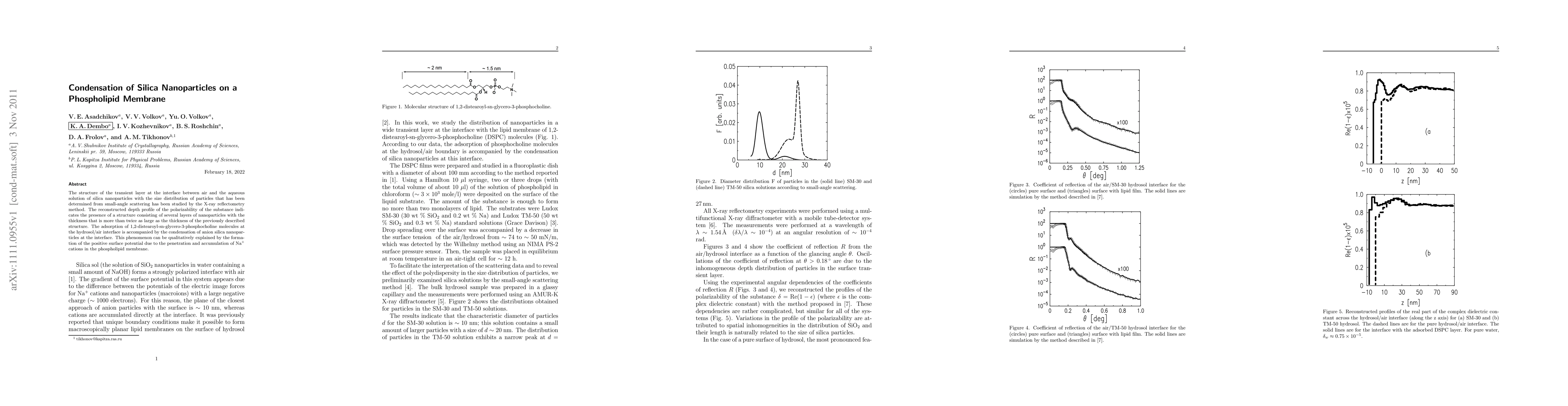 This study investigates the condensation of silica nanoparticles on a phospholipid membrane interface using X-ray reflectometry, revealing a multi-layered nanoparticle structure. The adsorption of phospholipid molecules induces nanoparticle condensation, likely due to the positive surface potential from the accumulation of Na+ cations.
