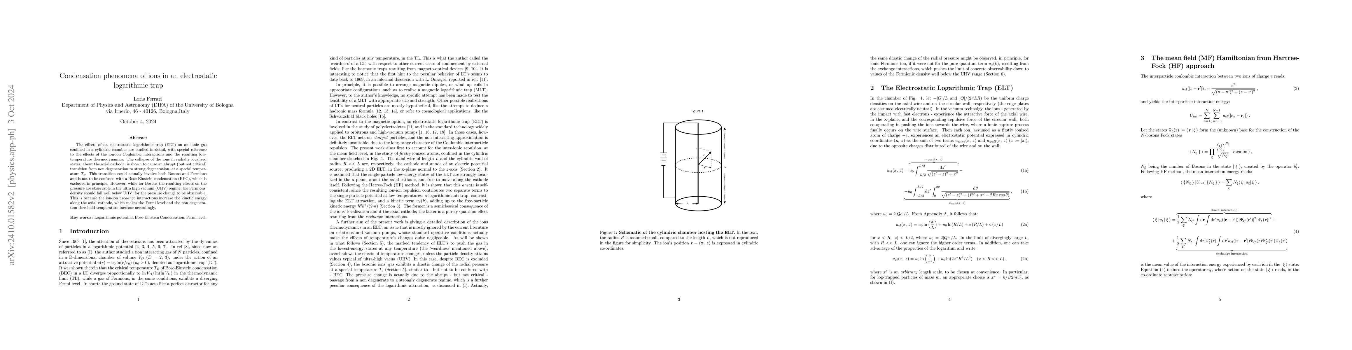 The effects of an electrostatic logarithmic trap (ELT) on an ionic gas confined in a cylindric chamber are studied in detail, with special reference to the effects of the ion-ion Coulombic interactions and the resulting low-temperature thermodynamics. The collapse of the ions in radially localized states, about the axial cathode, is shown to cause an abrupt (but not critical) transition from non degeneration to strong degeneration, at a special temperature $T_c$. This transition could actually involve both Bosons and Fermions and is not to be confused with a Bose-Einstein condensation (BEC), which is excluded in principle. However, while for Bosons the resulting effects on the pressure are observable in the ultra high vacuum (UHV) regime, the Fermions' density should fall well below UHV, for the pressure change to be observable. This is because the ion-ion \emph{exchange} interactions increase the kinetic energy along the axial cathode, which makes the Fermi level and the non degeneration threshold temperature increase accordingly.