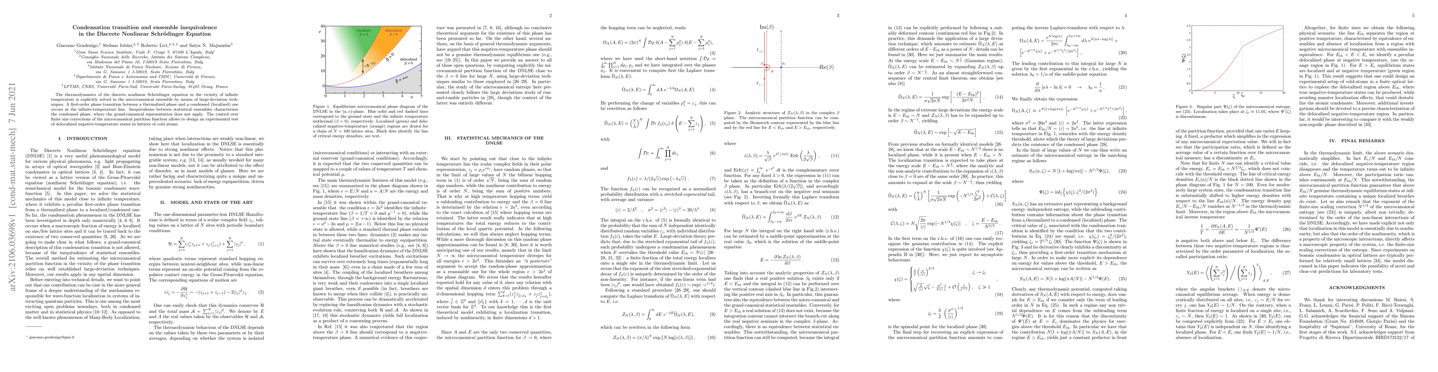 This paper explores the thermodynamics of the discrete nonlinear Schrödinger equation, revealing a first-order phase transition at infinite temperature between thermalized and condensed states. It highlights ensemble inequivalence in the condensed phase, suggesting a potential experimental test for delocalized negative-temperature states in cold atom lattices.