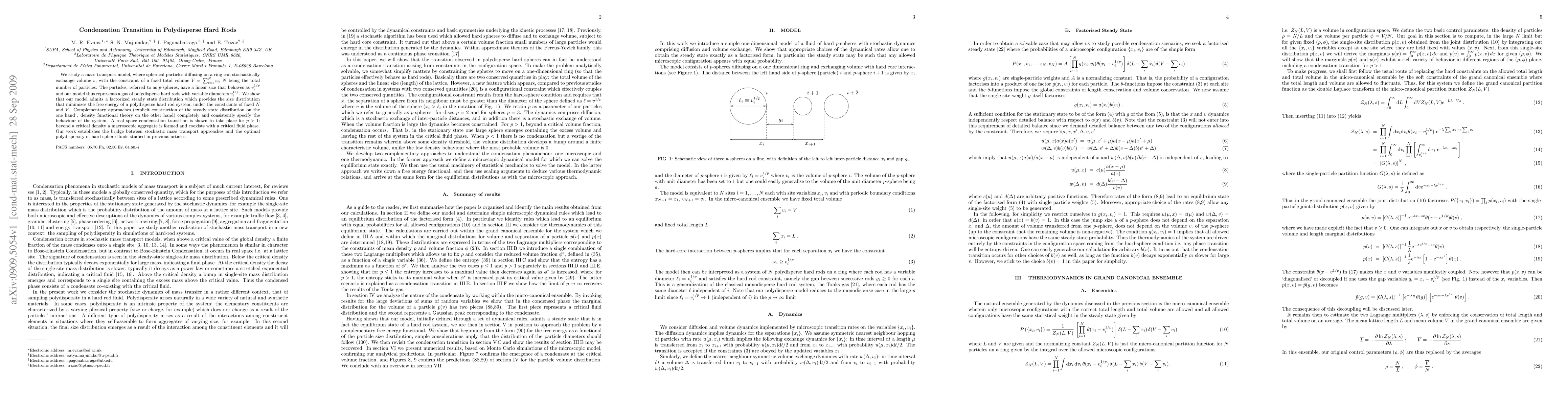 This paper investigates a mass transport model for polydisperse hard rods, revealing a condensation transition for $p>1$ where a macroscopic aggregate forms. The study establishes a steady state distribution that minimizes the system's free energy under fixed volume and particle number constraints.