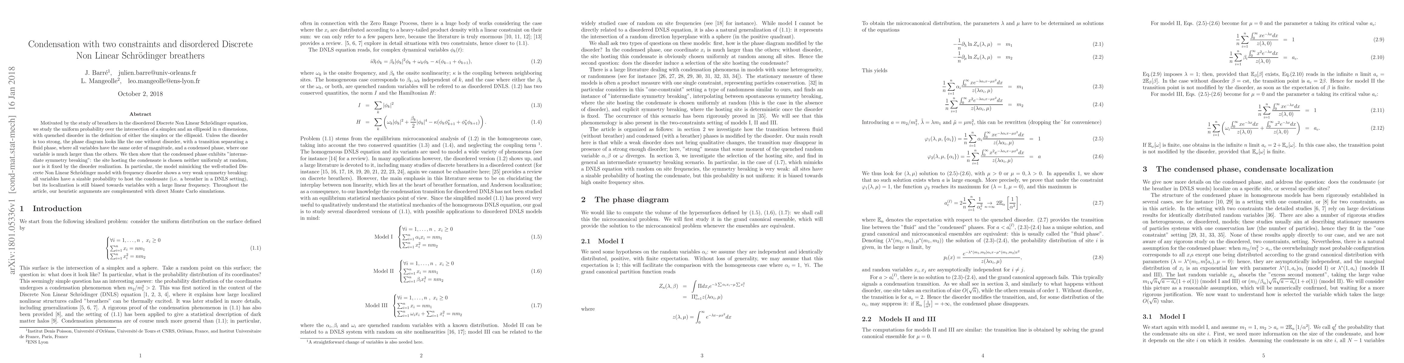 Motivated by the study of breathers in the disordered Discrete Non Linear Schr\"odinger equation, we study the uniform probability over the intersection of a simplex and an ellipsoid in $n$ dimensions, with quenched disorder in the definition of either the simplex or the ellipsoid. Unless the disorder is too strong, the phase diagram looks like the one without disorder, with a transition separating a fluid phase, where all variables have the same order of magnitude, and a condensed phase, where one variable is much larger than the others. We then show that the condensed phase exhibits "intermediate symmetry breaking": the site hosting the condensate is chosen neither uniformly at random, nor is it fixed by the disorder realization. In particular, the model mimicking the well-studied Discrete Non Linear Schr\"odinger model with frequency disorder shows a very weak symmetry breaking: all variables have a sizable probability to host the condensate (i.e. a breather in a DNLS setting), but its localization is still biased towards variables with a large linear frequency. Throughout the article, our heuristic arguments are complemented with direct Monte Carlo simulations.