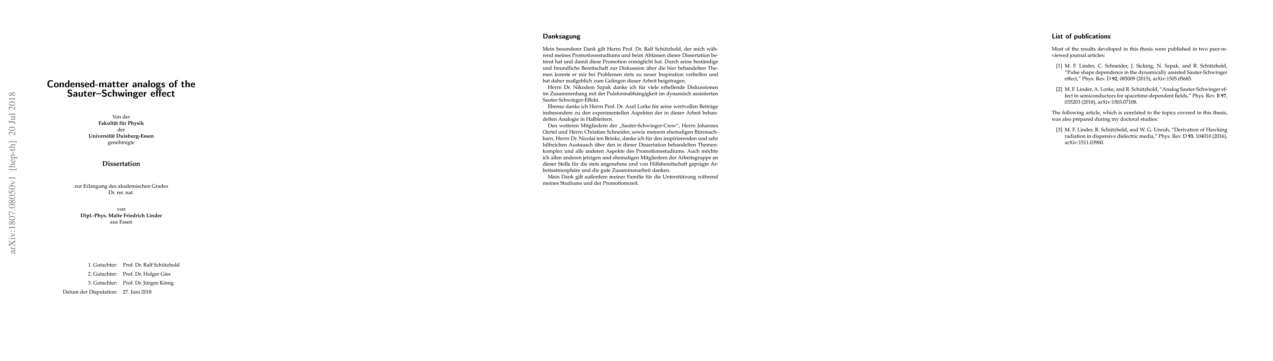 This paper investigates the Sauter-Schwinger effect, where electron-positron pairs are created in a quasiconstant electric field, and examines how the inclusion of weaker temporal pulses can enhance this effect. It proposes condensed-matter analogs in semiconductors to study this nonperturbative mechanism experimentally.