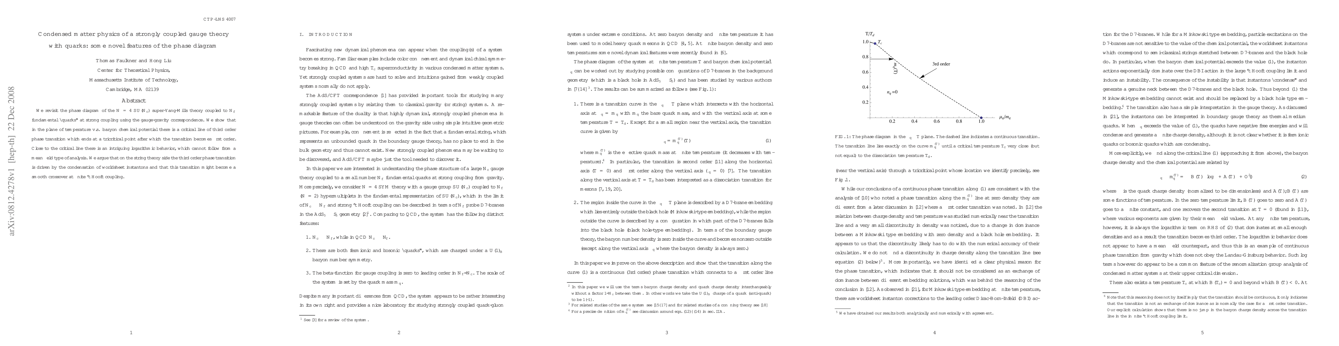 We revisit the phase diagram of the N=4 SU(N_c) super-Yang-Mills theory coupled to N_f fundamental "quarks" at strong coupling using the gauge-gravity correspondence. We show that in the plane of temperature v.s. baryon chemical potential there is a critical line of third order phase transition which ends at a tricritical point after which the transition becomes first order. Close to the critical line there is an intriguing logarithmic behavior, which cannot follow from a mean field type of analysis. We argue that on the string theory side the third order phase transition is driven by the condensation of worldsheet instantons and that this transition might become a smooth crossover at finite 't Hooft coupling.