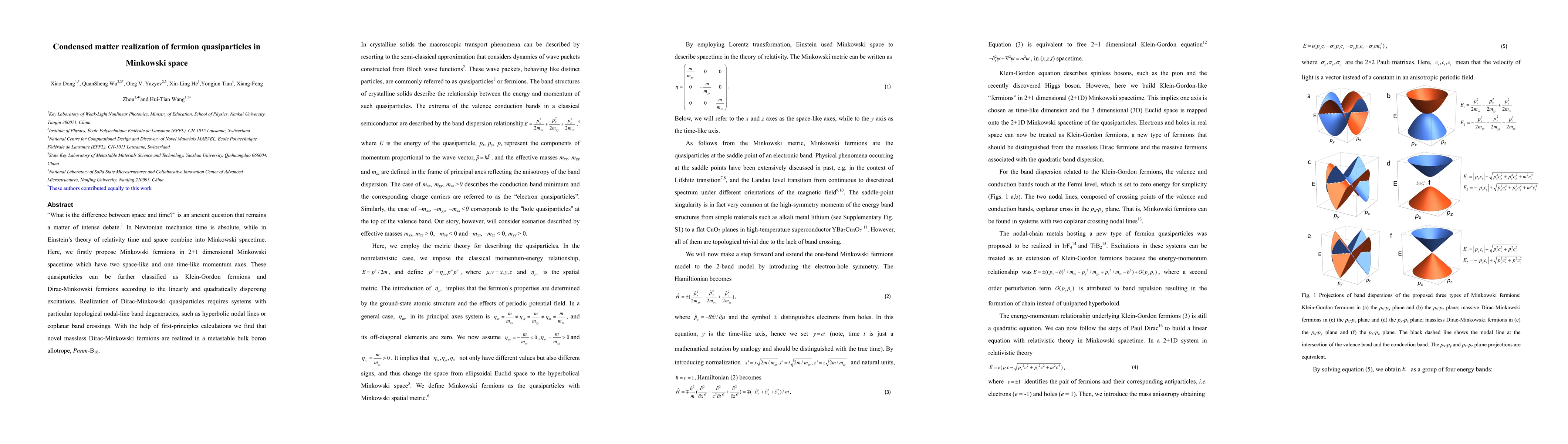 "What is the difference between space and time?" is an ancient question that remains a matter of intense debate. In Newtonian mechanics time is absolute, while in Einstein's theory of relativity time and space combine into Minkowski spacetime. Here, we firstly propose Minkowski fermions in 2+1 dimensional Minkowski spacetime which have two space-like and one time-like momentum axes. These quasiparticles can be further classified as Klein-Gordon fermions and Dirac-Minkowski fermions according to the linearly and quadratically dispersing excitations. Realization of Dirac-Minkowski quasiparticles requires systems with particular topological nodal-line band degeneracies, such as hyperbolic nodal lines or coplanar band crossings. With the help of first-principles calculations we find that novel massless Dirac-Minkowski fermions are realized in a metastable bulk boron allotrope, Pnnm-B16.