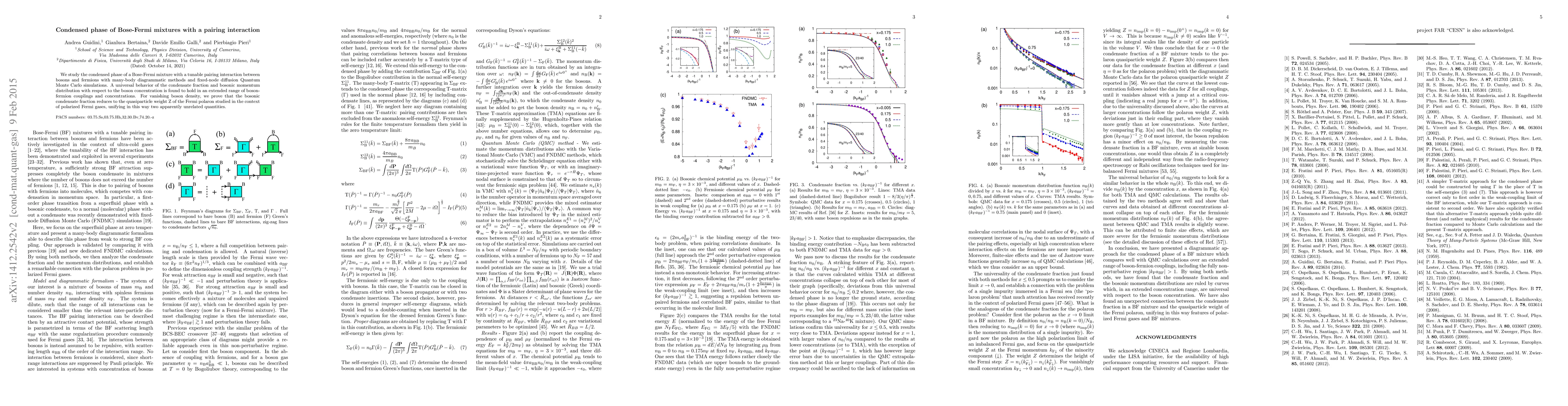 We study the condensed phase of a Bose-Fermi mixture with a tunable pairing interaction between bosons and fermions with many-body diagrammatic methods and fixed-node diffusion Quantum Monte Carlo simulations. A universal behavior of the condensate fraction and bosonic momentum distribution with respect to the boson concentration is found to hold in an extended range of boson-fermion couplings and concentrations. For vanishing boson density, we prove that the bosonic condensate fraction reduces to the quasiparticle weight Z of the Fermi polaron studied in the context of polarized Fermi gases, unifying in this way two apparently unrelated quantities.
