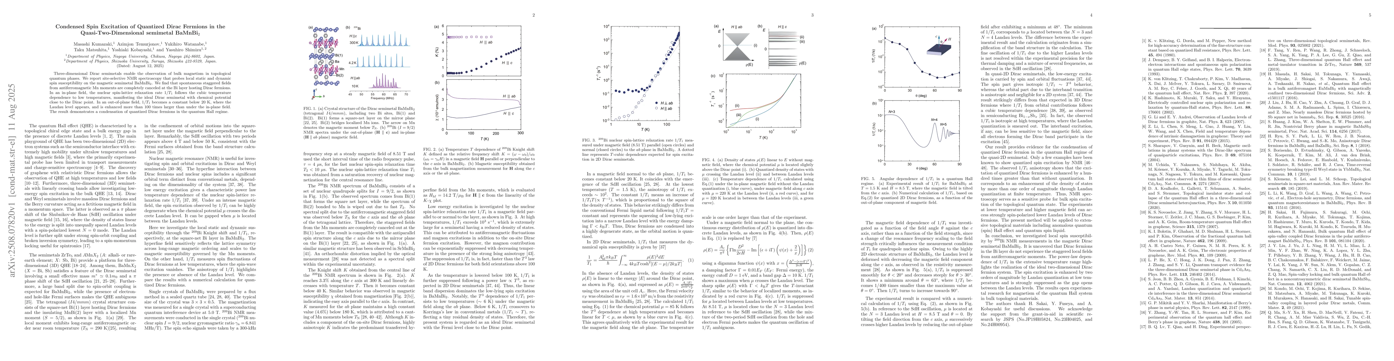 Three-dimensional Dirac semimetals enable the observation of bulk magnetism in topological quantum phases. We report site-selective NMR spectroscopy that probes local static and dynamic spin susceptibility on the magnetic semimetal BaMnBi$_2$. We find that spontaneous staggered fields from antiferromagnetic Mn moments are completely canceled at the Bi layer hosting Dirac fermions. In an in-plane field, the nuclear spin-lattice relaxation rate $1/T_1$ follows the cubic temperature dependence to low temperatures, manifesting the ideal Dirac semimetal with chemical potential close to the Dirac point. In an out-of-plane field, $1/T_1$ becomes a constant below 20 K, where the Laudau level appears, and is enhanced more than 100 times larger than under the in-plane field. The result demonstrates a condensation of quantized Dirac fermions in the quantum Hall regime.
