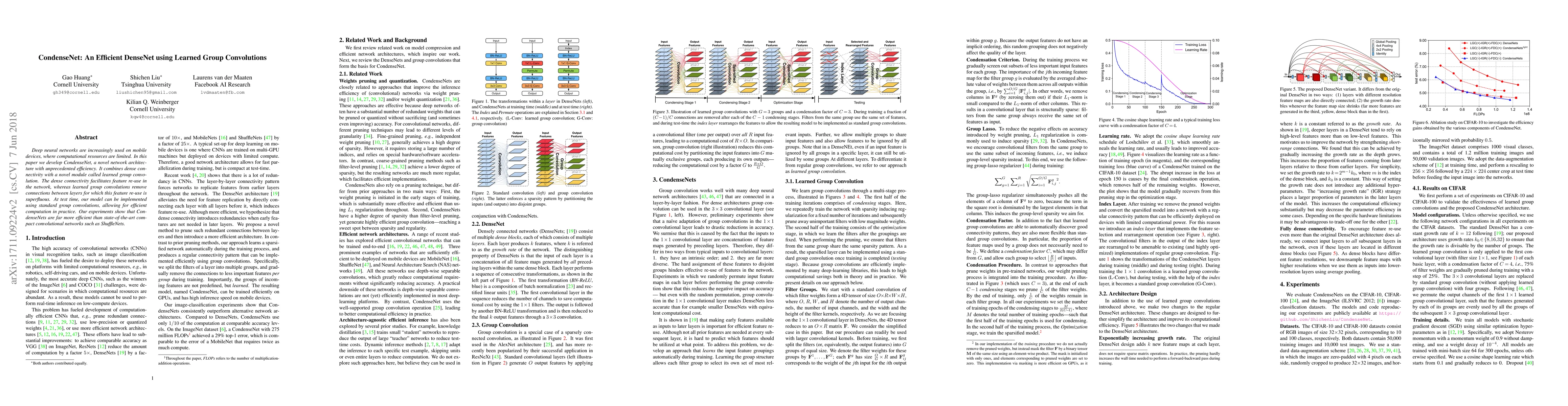 Deep neural networks are increasingly used on mobile devices, where computational resources are limited. In this paper we develop CondenseNet, a novel network architecture with unprecedented efficiency. It combines dense connectivity with a novel module called learned group convolution. The dense connectivity facilitates feature re-use in the network, whereas learned group convolutions remove connections between layers for which this feature re-use is superfluous. At test time, our model can be implemented using standard group convolutions, allowing for efficient computation in practice. Our experiments show that CondenseNets are far more efficient than state-of-the-art compact convolutional networks such as MobileNets and ShuffleNets.