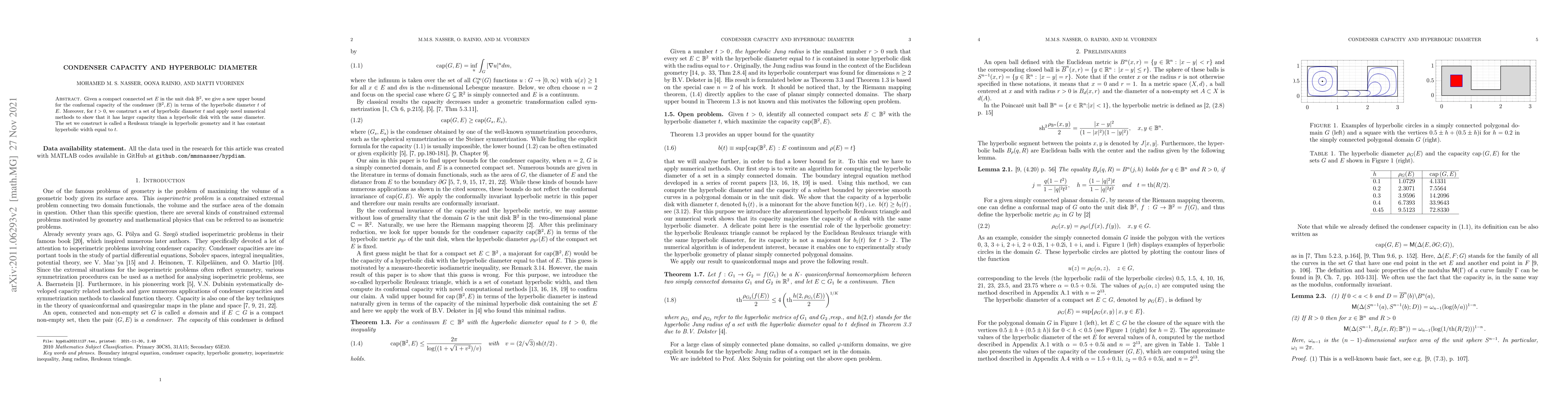 This paper provides a new upper bound for the conformal capacity of a condenser in the unit disk in terms of the hyperbolic diameter of the set $E$. It constructs a Reuleaux triangle in hyperbolic geometry with a larger capacity than a hyperbolic disk of the same diameter, demonstrating novel numerical methods.