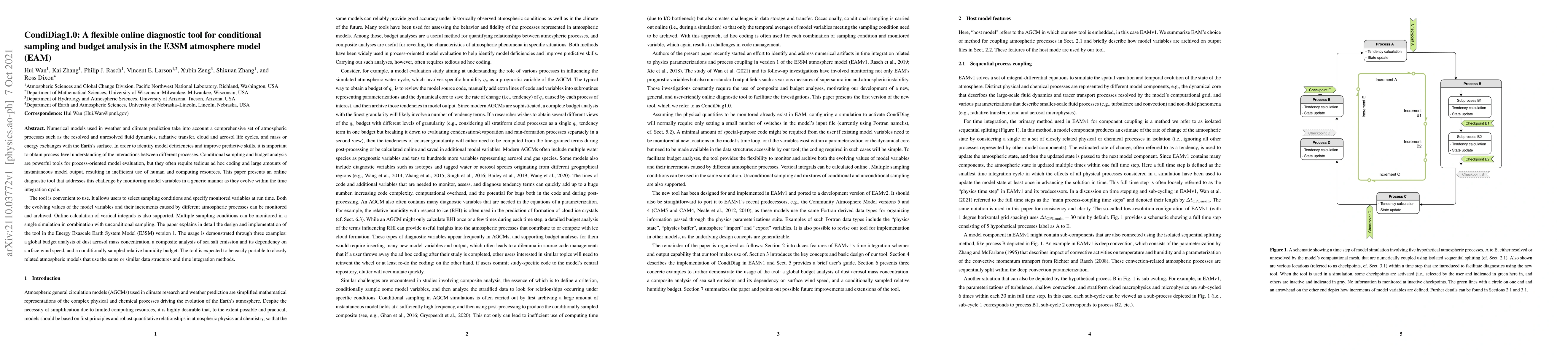 **Summary:** CondiDiag1.0 is an online diagnostic tool designed to facilitate conditional sampling and budget analysis in the E3SM atmosphere model, enabling efficient process-oriented model evaluation without extensive coding. It supports monitoring of model variables and their interactions in real-time, with applications demonstrated in aerosol mass concentration, sea salt emission, and relative humidity budget analyses.