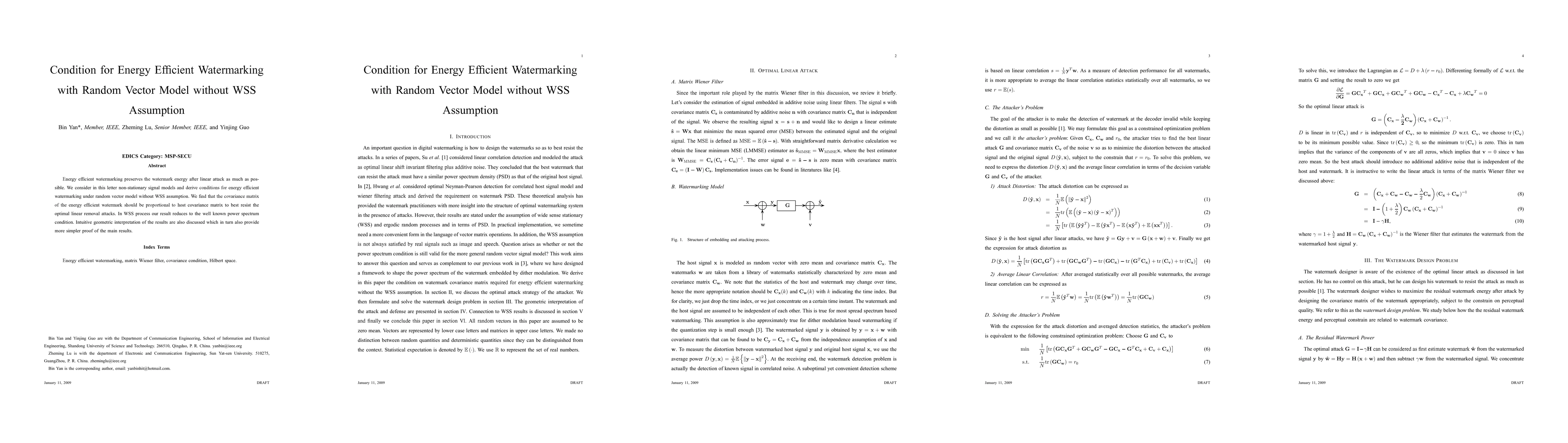 This research derives conditions for energy-efficient watermarking in non-stationary signals, without the Wide-Sense Stationarity (WSS) assumption. It finds that the watermark's covariance matrix should match the host's proportionally for optimal resistance against linear attacks. The findings also offer a simpler proof and geometric interpretation.