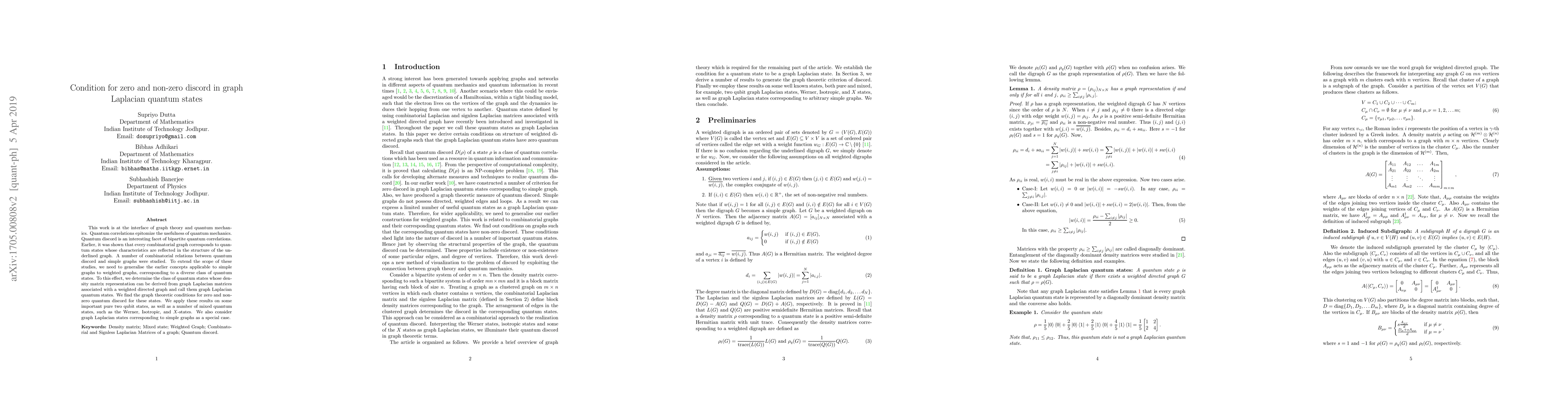 This paper investigates the quantum discord in graph Laplacian quantum states derived from weighted directed graphs, determining conditions for zero and non-zero discord. It applies these findings to various pure and mixed quantum states, including Werner, Isotropic, and $X$-states.