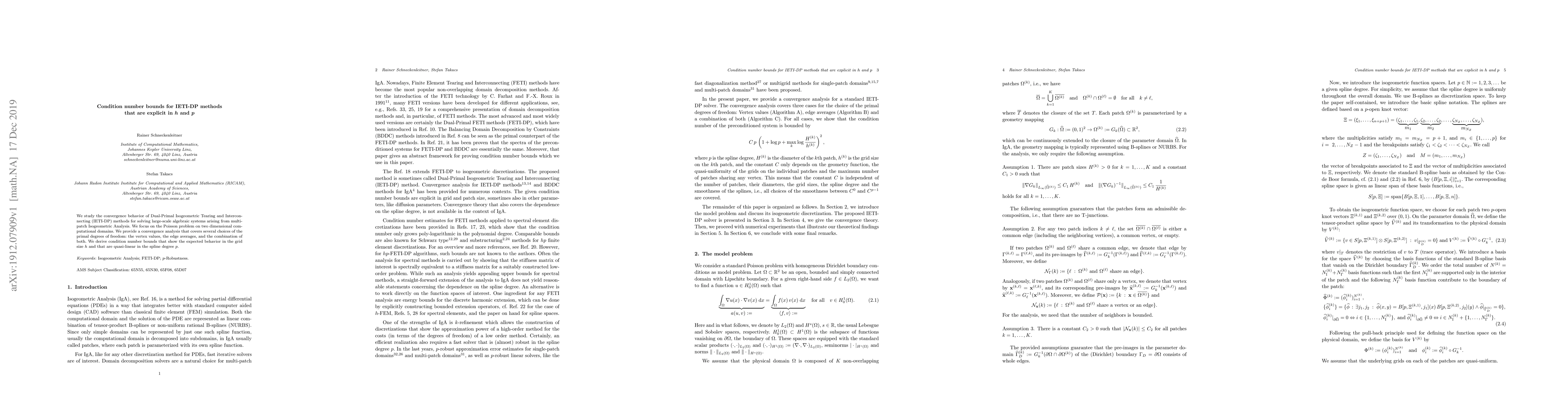 We study the convergence behavior of Dual-Primal Isogeometric Tearing and Interconnecting (IETI-DP) methods for solving large-scale algebraic systems arising from multi-patch Isogeometric Analysis. We focus on the Poisson problem on two dimensional computational domains. We provide a convergence analysis that covers several choices of the primal degrees of freedom: the vertex values, the edge averages, and the combination of both. We derive condition number bounds that show the expected behavior in the grid size h and that are quasi-linear in the spline degree p.