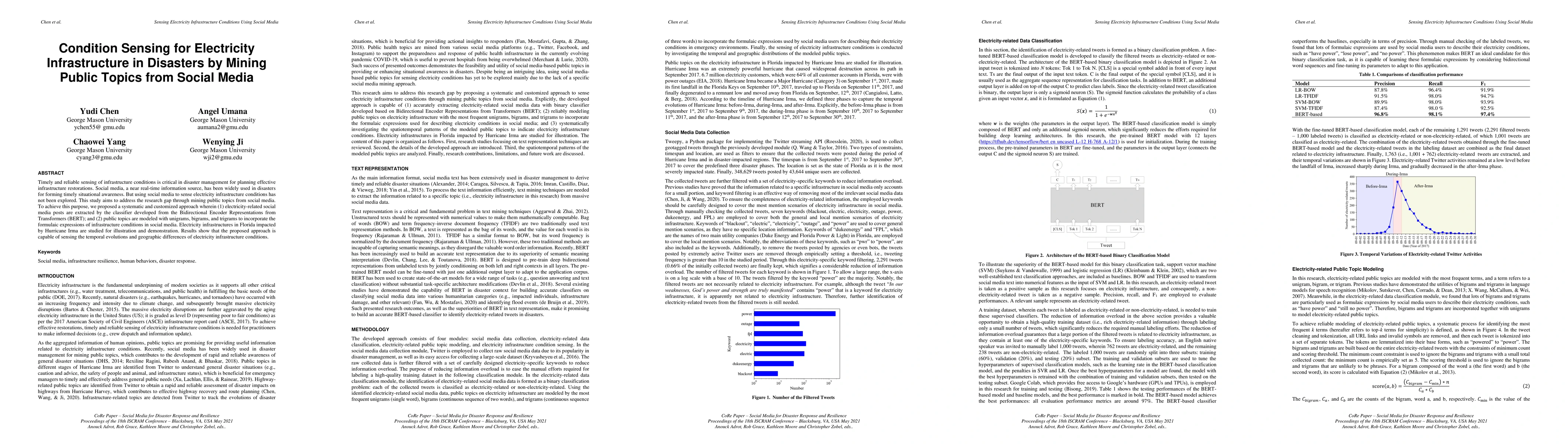 This study proposes a systematic approach to sense electricity infrastructure conditions in disasters by mining public topics from social media, using a BERT-based classifier and topic modeling with unigrams, bigrams, and trigrams. The method is demonstrated on Florida's infrastructure affected by Hurricane Irma, showing its ability to capture temporal and geographic variations in infrastructure conditions.