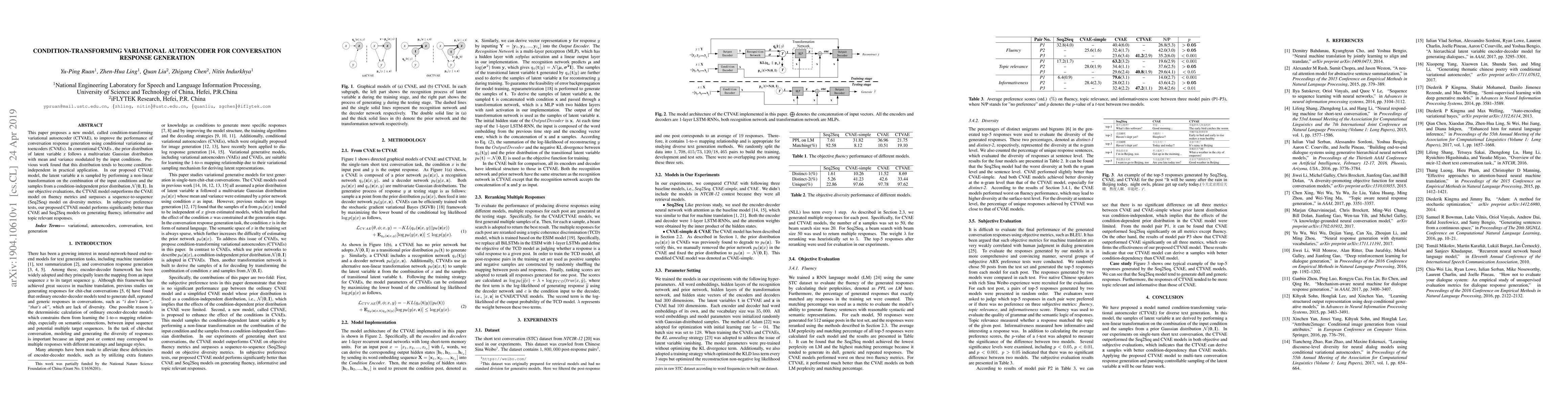 This paper introduces a condition-transforming variational autoencoder (CTVAE) to enhance conversation response generation, outperforming conventional CVAEs and Seq2Seq models in fluency, diversity, and relevance metrics. The CTVAE improves latent variable sampling by transforming input conditions and a condition-independent prior.