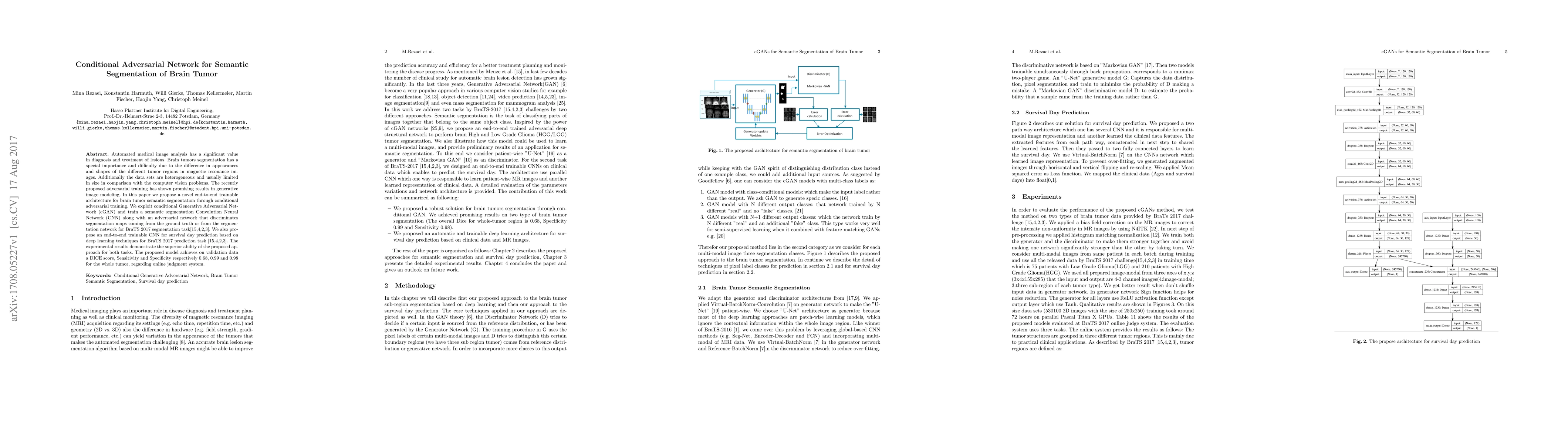 This paper proposes a novel end-to-end trainable architecture using conditional adversarial training for brain tumor semantic segmentation and survival prediction in MRI images. The model achieves superior results with a DICE score of 0.68, sensitivity of 0.99, and specificity of 0.98 for whole tumor segmentation.